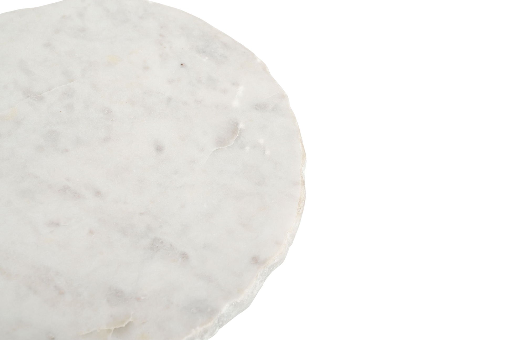 The Aeirith accent table embodies modern sophistication with its unique design and high-quality materials. Its spherical sand-blasted white marble base perfectly complements the live-edge white marble top, creating a stunning focal point for any room. The solid iron frame finished in antique brass adds a touch of warmth and elegance to the overall aesthetic. Crafted with attention to detail, this accent table showcases the natural beauty of marble with its sandblasted texture and distinctive live-edge feature.