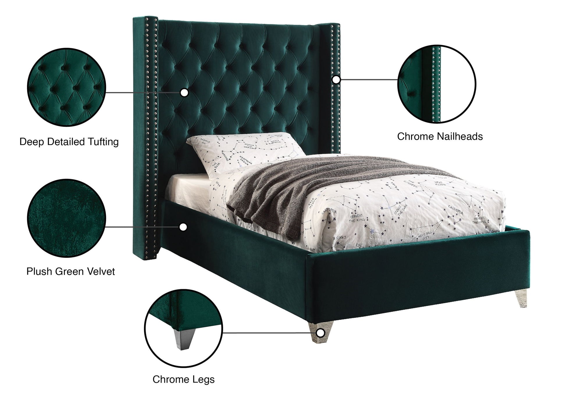 Elegant and eye-catching, the stunning Aiden Bed from Meridian Furniture is the perfect addition to any bedroom. velvet covers the deep tufted design. A beautiful wing bed design is complimented by hand applied nail head details. Strength and beauty is guaranteed with a solid wood frame and stainless steel legs.