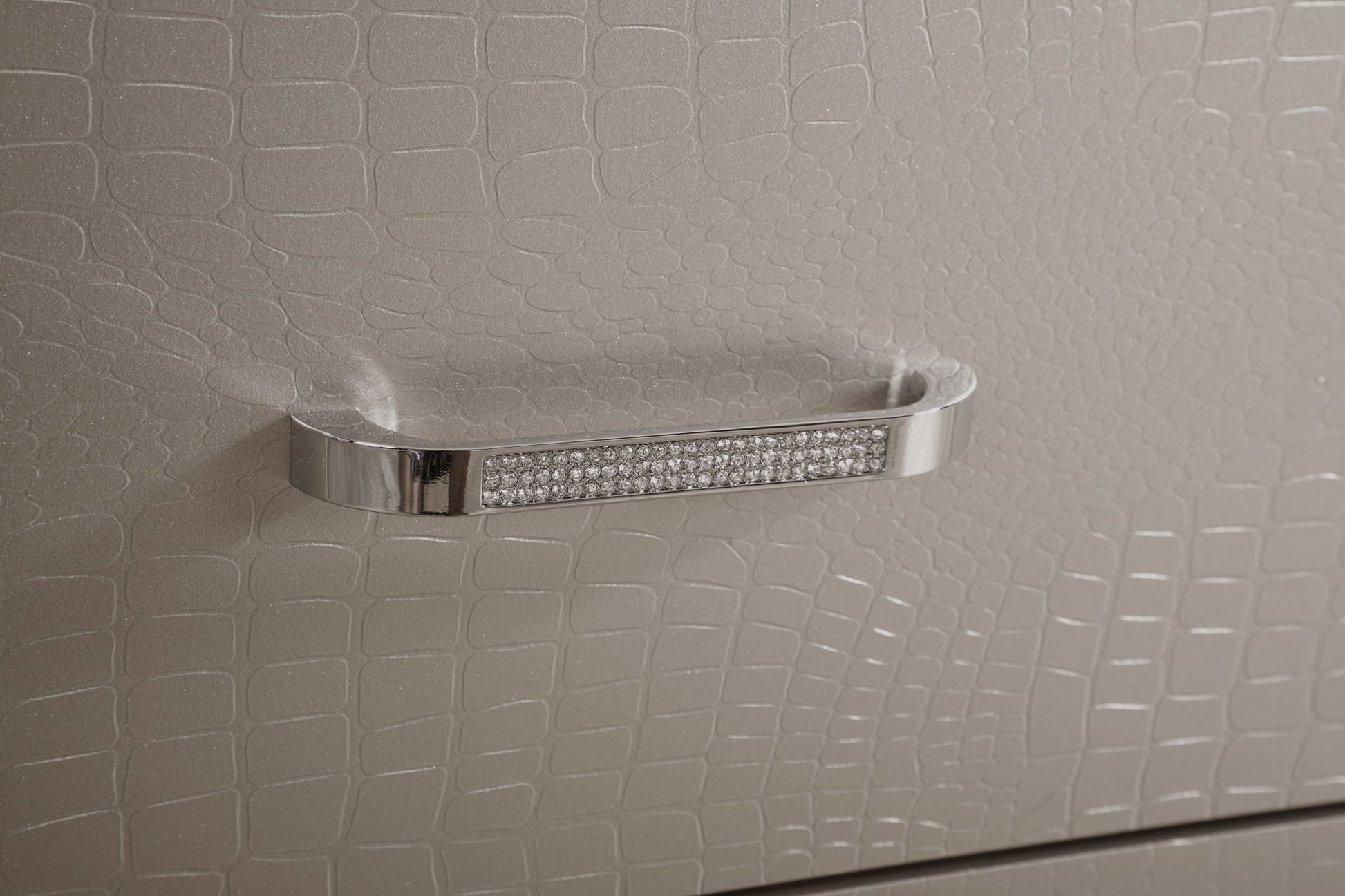 - Chrome pulls with faux crystals add a sophisticated touch to the overall design of the nightstand