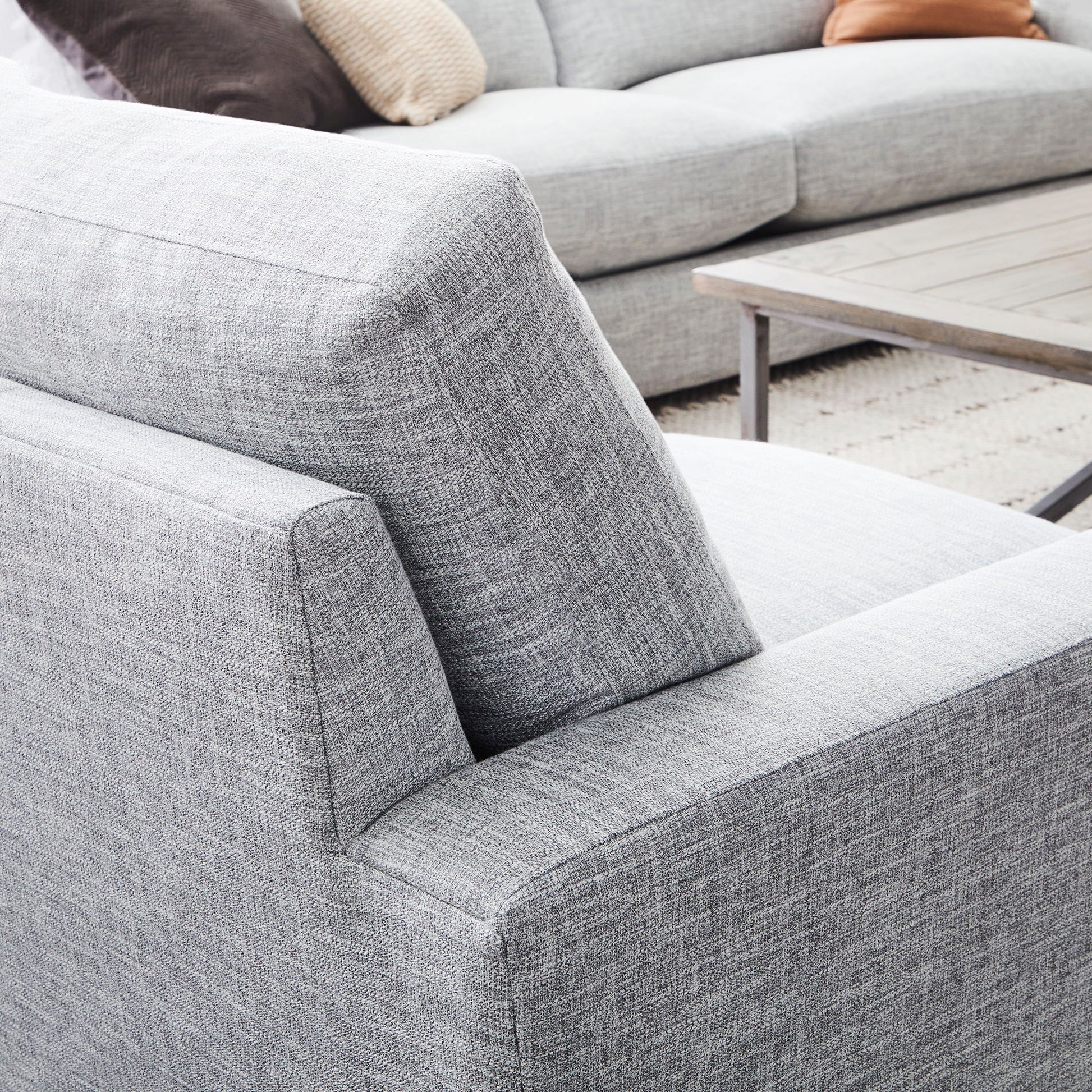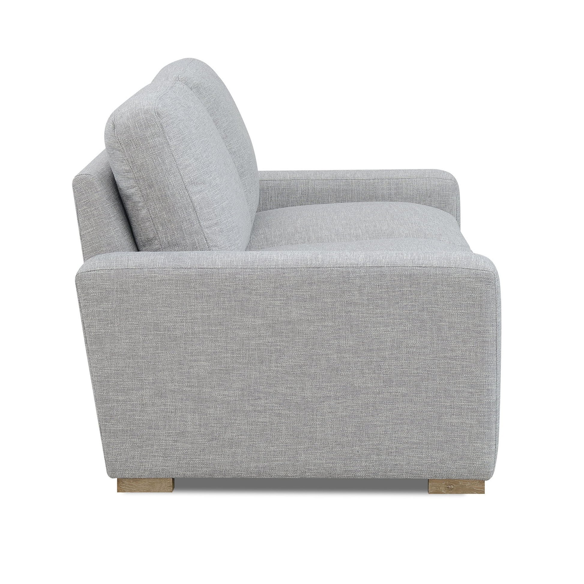 A low-armed loveseat with comfortable, square cushions upholstered in an impeccable tweed weave.