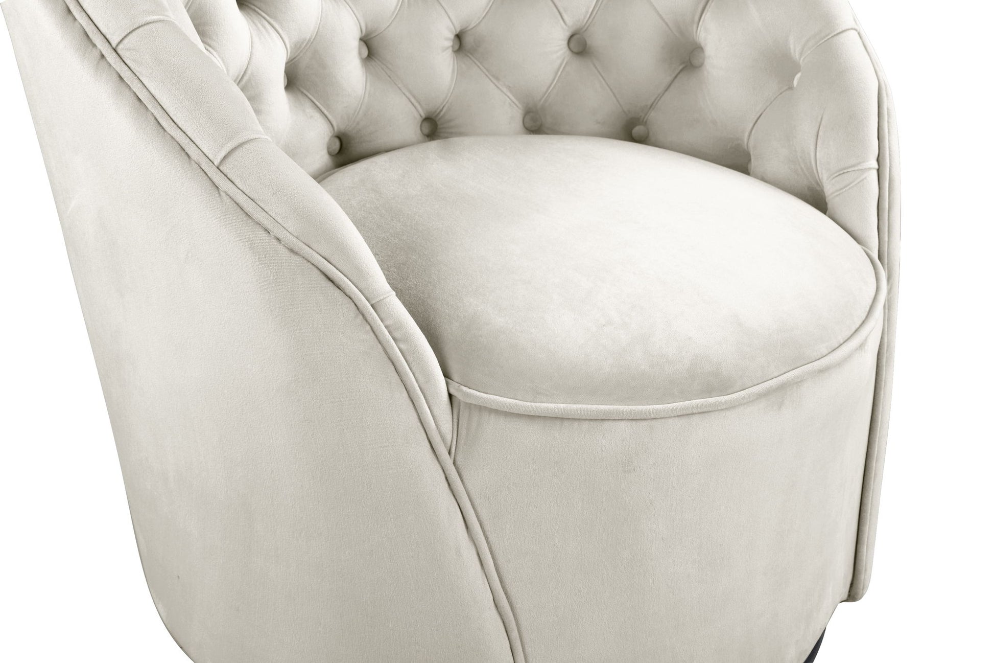 Give your living space a sophisticated makeover with this Alessio Accent Chair from Meridian Furniture. This swivel base accent chair has luxurious velvet upholstery that provides you with a soft, comfortable place to sit while you cozy up with your favorite book or curl up in front of your favorite TV show or movie. Deep button tufting on the inner back adds to its contemporary design, making it the perfect addition to any room in your home.