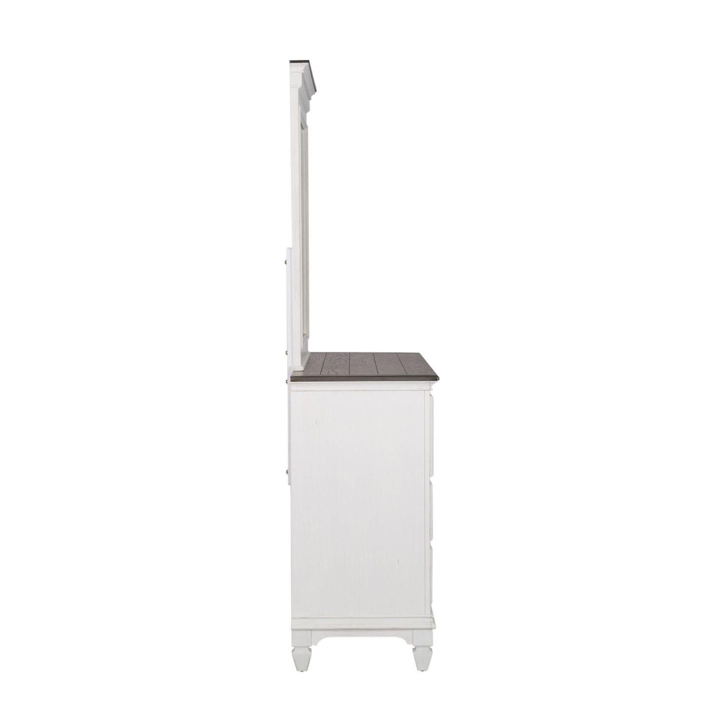 Design possibilities are endless with the Allyson Park dresser and mirror. Crafted of pine solids with cathedral oak tops, this piece features a wire-brushed forest finish. The dresser has eight wood framed full extension drawers of varying sizes, all of which offer plenty of deep storage. The top drawers have felt lining. The bead molding, square tapered feet. Attach the crown mirror with a beveled edge with the included bolt-on supports. Allyson Park offers cottage styles you love in a wire brushed two tone finish that will work from the beach to the mountains to an industrial loft.
