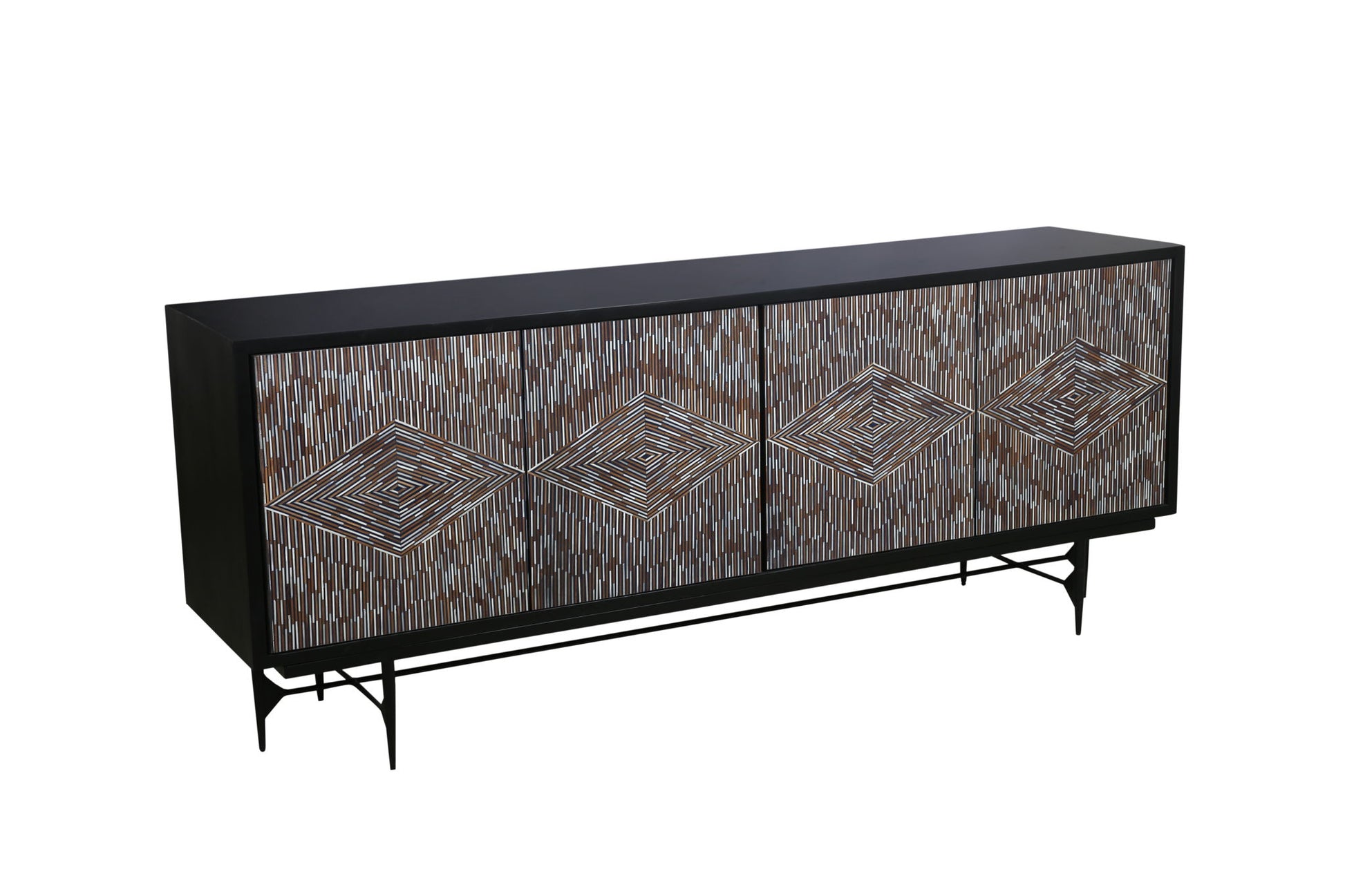 The Andreas Server features a stunning contemporary design, blending striking materials and a visually captivating diamond patterned door design. Crafted from solid mango wood in an ebonized finish, the case frame exudes elegance and depth. The doors are a standout element, showcasing a unique mix of multi colored bone and resin, creating an intricate, eye-catching pattern. The custom-designed thin iron base elevates the piece, adding a sleek, modern feel. Behind the four doors, you'll find fixed shelves and media cord management, offering both style and functionality in a beautifully crafted piece.