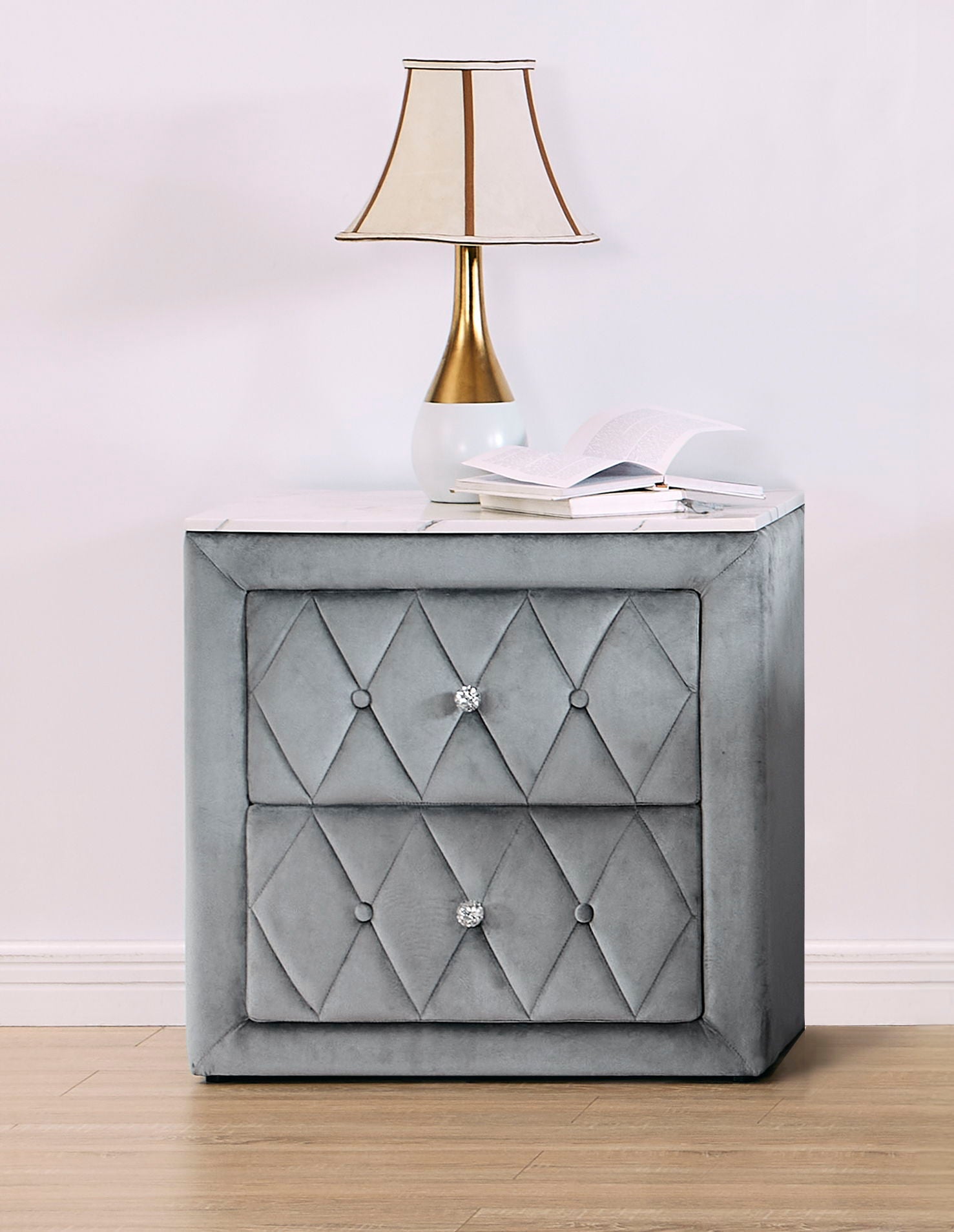 This majestic nightstand is a statement piece that exudes luxury and grandeur, perfect for creating a dramatic bedroom setting. It boasts a finish that encapsulates modern opulence, while its sumptuous, tufted nightstand are upholstered in a rich velvet fabric that offers an indulgent tactile experience.