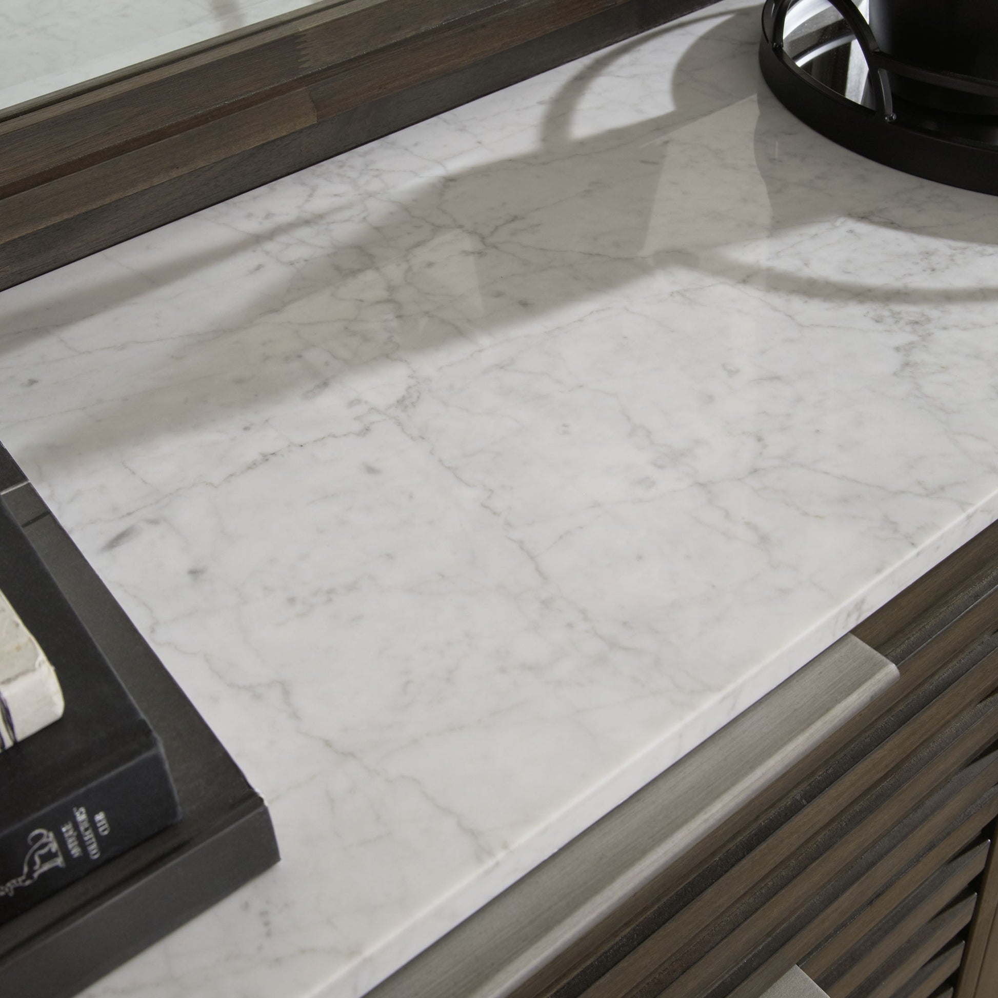 Clean lines lend sophistication and structure to this bedroom group. Its complex rich finish, slats set in a contemporary herringbone pattern, and low-profile footboard create visual interest and add to this bed's contemporary vibe with a white marble top, while the streamlined silhouette features overlay slats to create visual interest. In addition, dual USB charging ports are conveniently built into each side of the headboard—what a plus for keeping your electronic devices charged and at your fingertips.