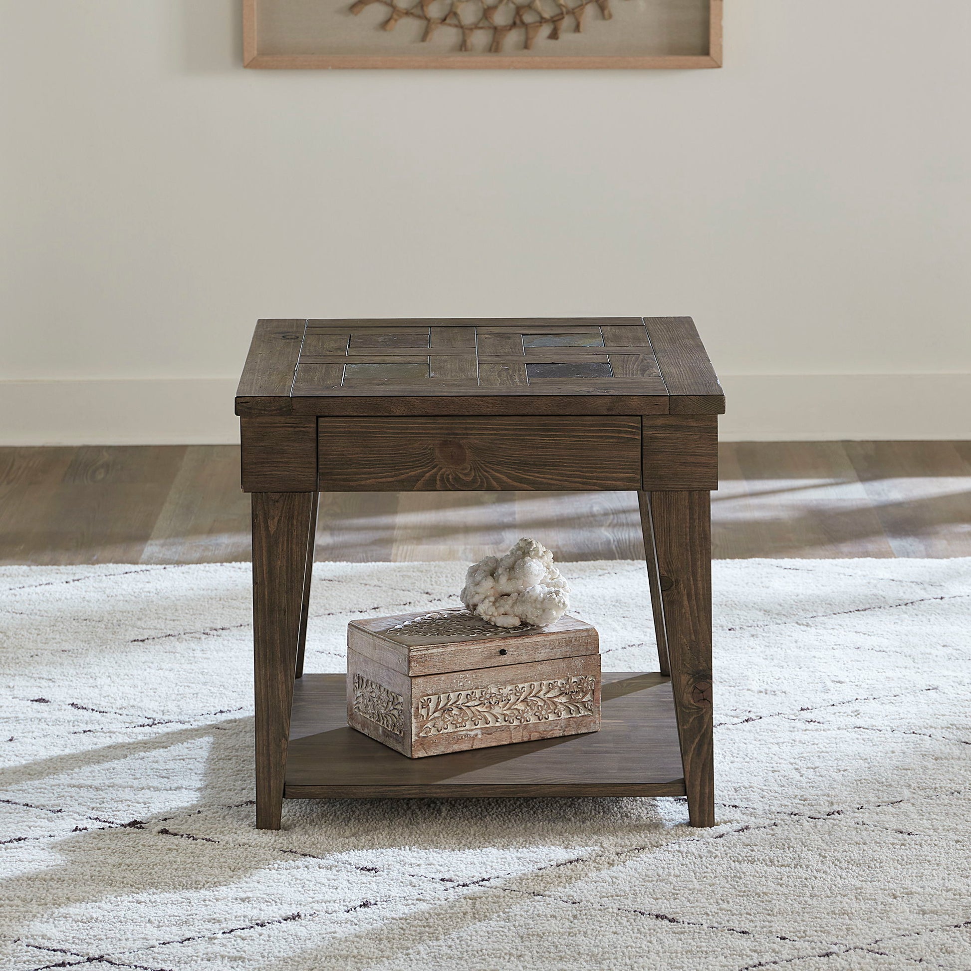 If you enjoy rustic the Arrowcreek end table is for you. Finished in a weathered stone with slate tile inserts in a basket weave design on top, one full extension drawer with finger pull, tapered legs and bottom shelf for additional storage. Crafted with solid reclaimed pine and pine veneer with a bottom shelf for additional storage.