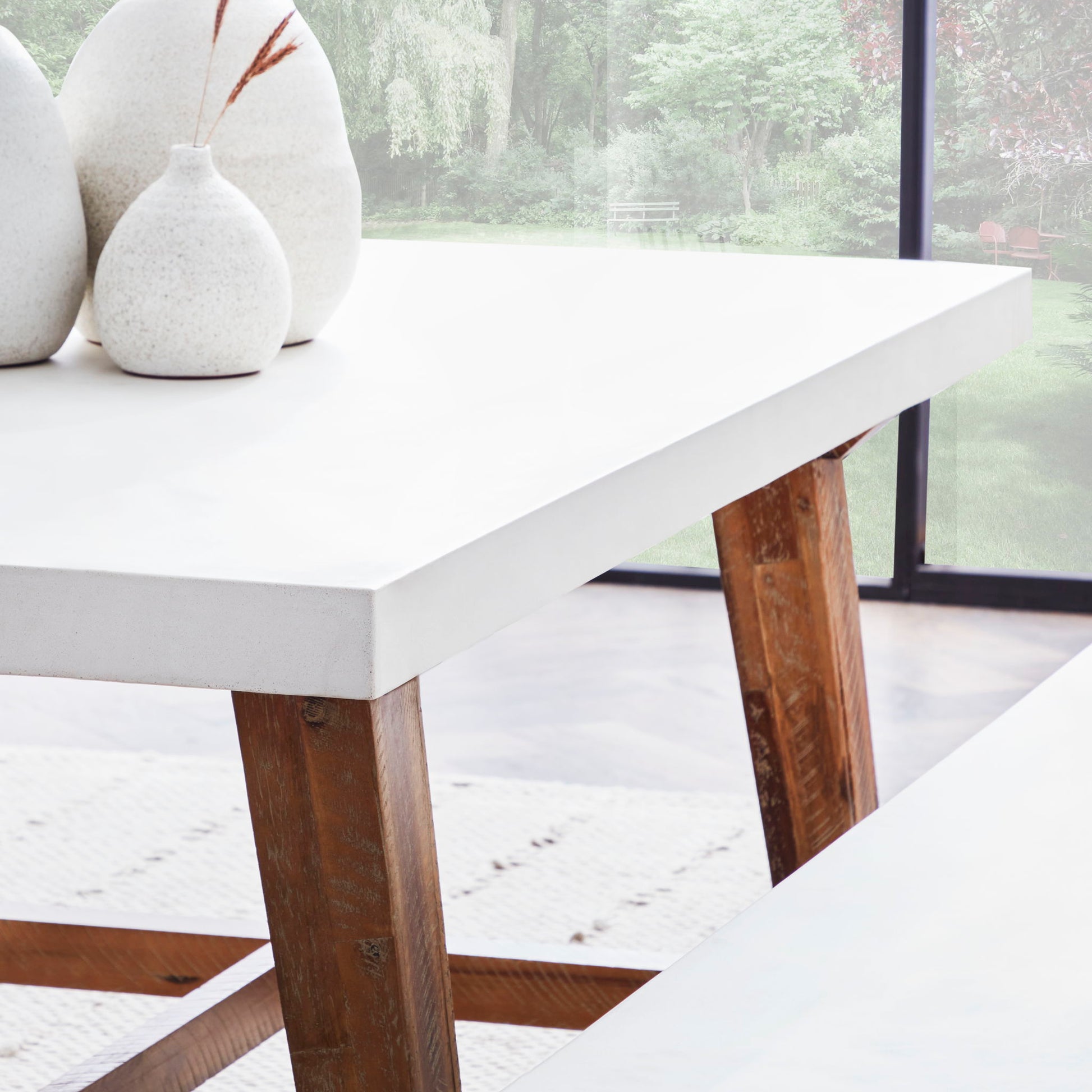 A rustic and modern dining table with a molded concrete top and weathered wood beams.