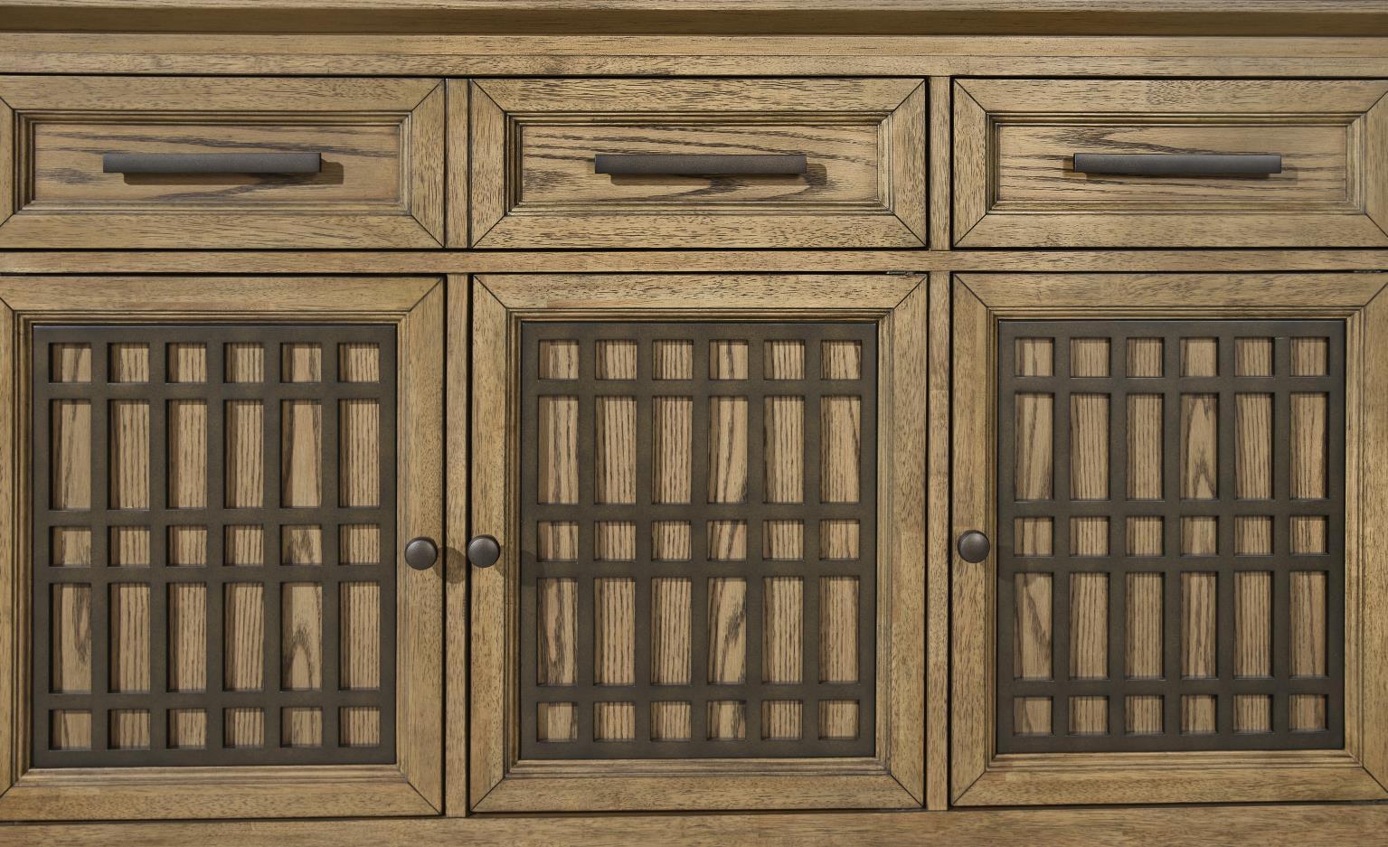 Crafted of Hardwood Solids with Oak Veneers in a Dusty Barley finish,, the Beacon Hill bedroom and dining furniture collection has an Arts & Crafts-inspired design that offers a fresh traditional look. Striking grid-like wood fretwork on the headboards and some case pieces are finished in a contrasting metal-colored finish that matches the Oiled Bronze hardware.
