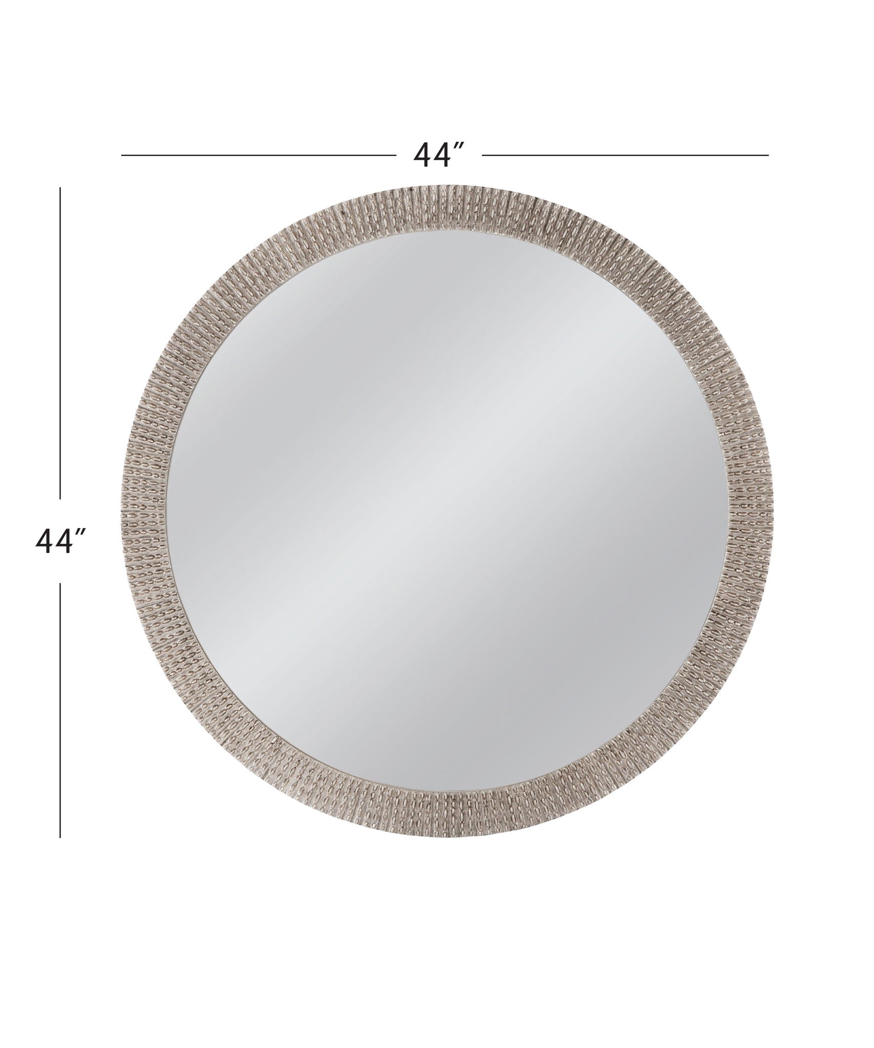 The Beatrice Wall Mirror showcases a round textured patterned frame, adorned with an antique silver leaf finish. Its intricate design adds sophistication to any space. With meticulous craftsmanship, this mirror elevates your decor with timeless elegance.