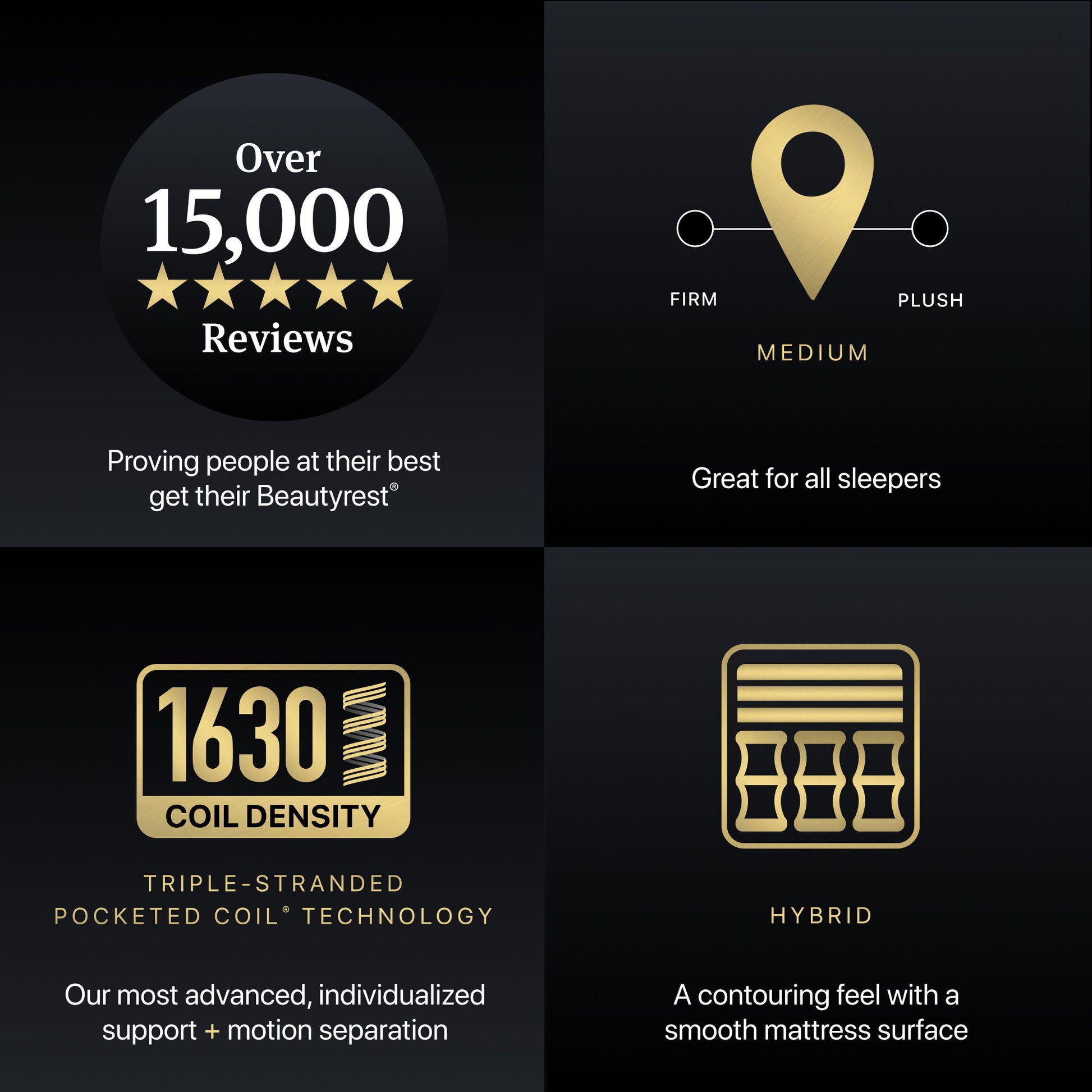Experience the best of both worlds with Beautyrest Black® Hybrid Series Three XCS models—innovated to provide our most advanced, individualized support + motion separation with a contouring feel and exceptional cooling. Triple-Stranded Pocketed Coil® Technology powers your sleep performance, conforming to isolate movement and support your shape so you rest undisturbed. FORM™ HD Material deeply contours to your body without restricting your movements for a deep cradling sensation that won’t make you feel stuck in the mattress. Plus, Dynamic Response® Memory Foam relieves pressure and Micro Diamond™ Memory Foam helps promote cooling for peak comfort. Engineered for enhanced cooling, BlackICE® Max Cooling Technology boosts cooling power by 30%, moving body heat so you sleep cooler, longer, and our cool-to-the-touch Sleep Climate™ Surface tops it all for a cool sleep. Featuring a dynamically-designed ContourCover™ that allows for split-head sizing, perfect to pair with a split-head adjustable base for customizable comfort, Series Three XCS models help you experience the best of Beautyrest® every night.