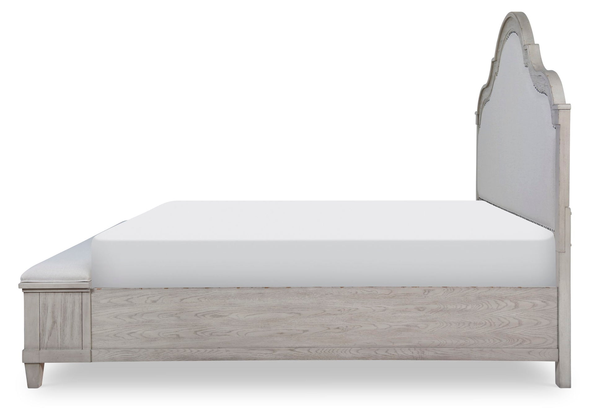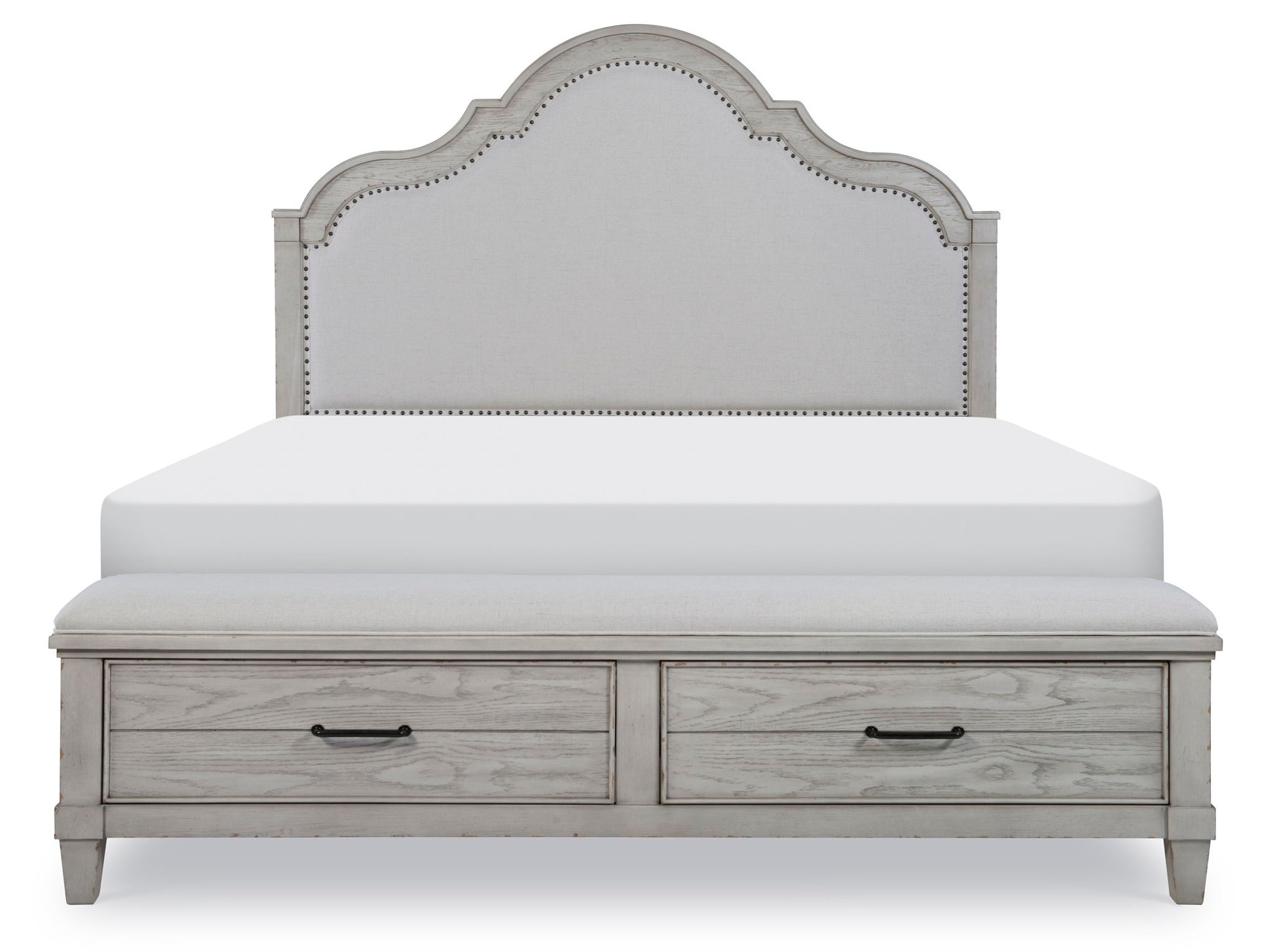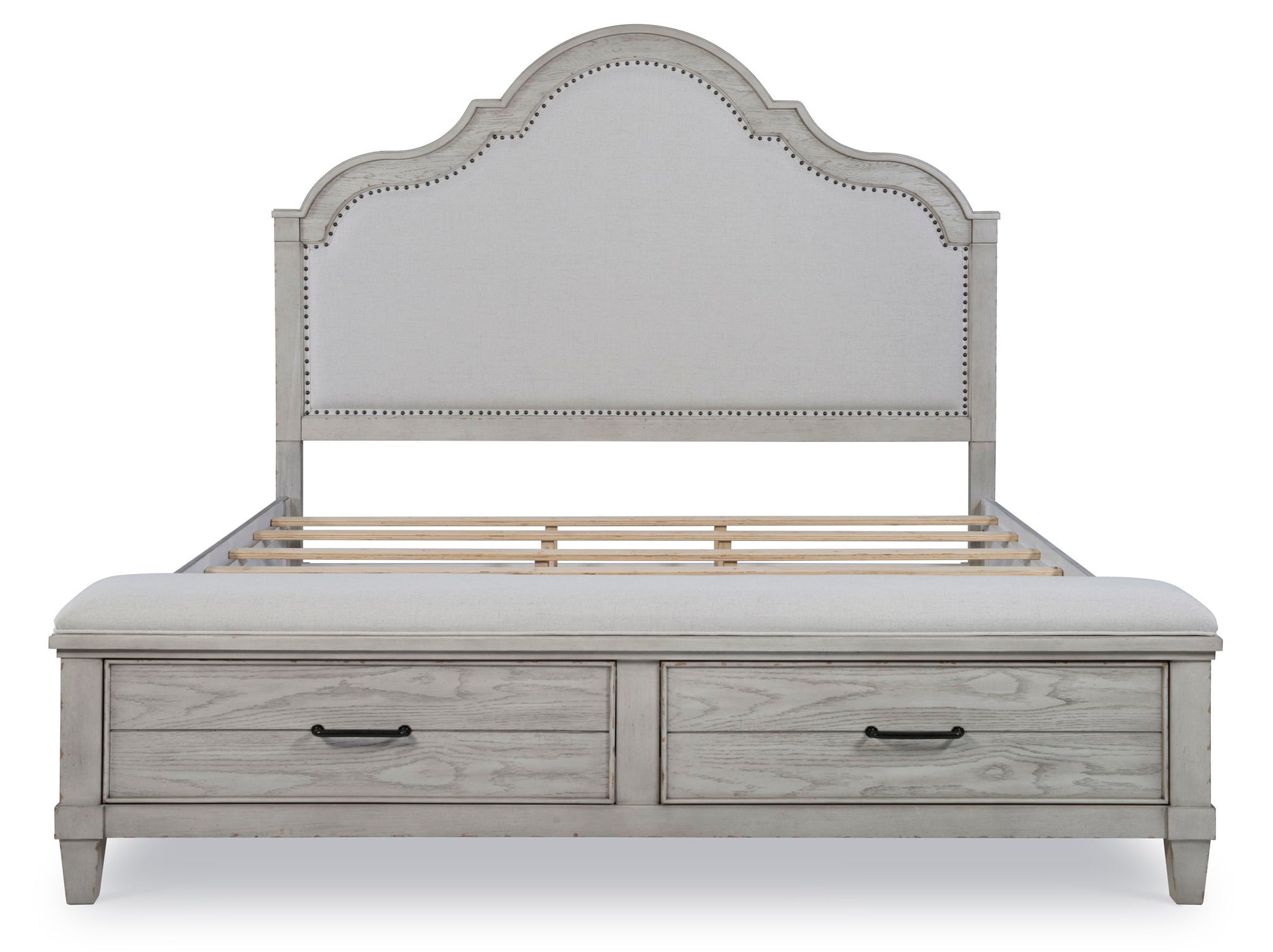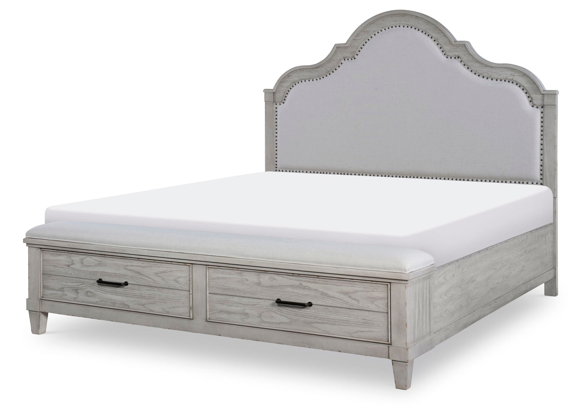 Create an inviting space with lots of character with Belhaven upholstered panel bed. A truly relaxed and welcoming style, the coastal, cottage and modern farmhouse design elements found through out blend well and create a versatile tone. The Weathered Plank finish has a white washed look with wire brushing, distressing and worn edges that all add to the authentic feel. A nailhead trim outlines the upholstered headboard in a graceful arched shape. Tuck blankets away in one of the two cedar-lined footboard drawers that pop with forged iron hardware. The footboard also features an upholstered bench that provides the perfect spot to sit while you lace up your shoes. The Belhaven upholstered storage bed will add style and value to the home for years to come.