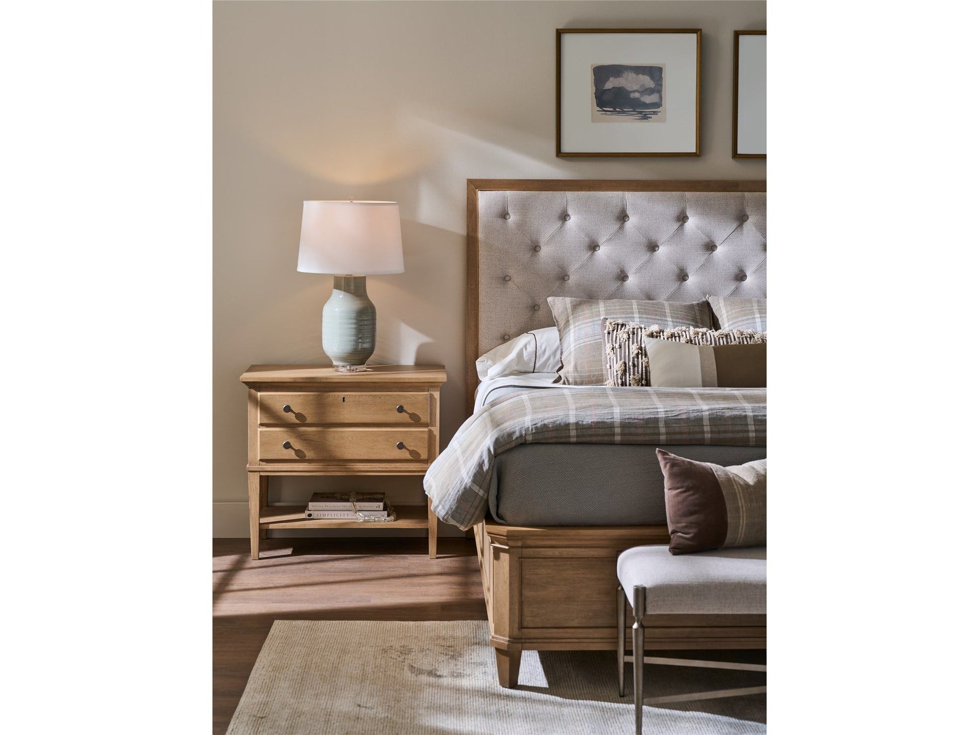 The Upholstered Bed is a study in texture, pairing the rich finish with a plush, high headboard upholstered in the textural Bilma Natural fabric. The generous, tailored frame introduces a soft quality that encourages luxurious rest while maintaining a sophisticated look.