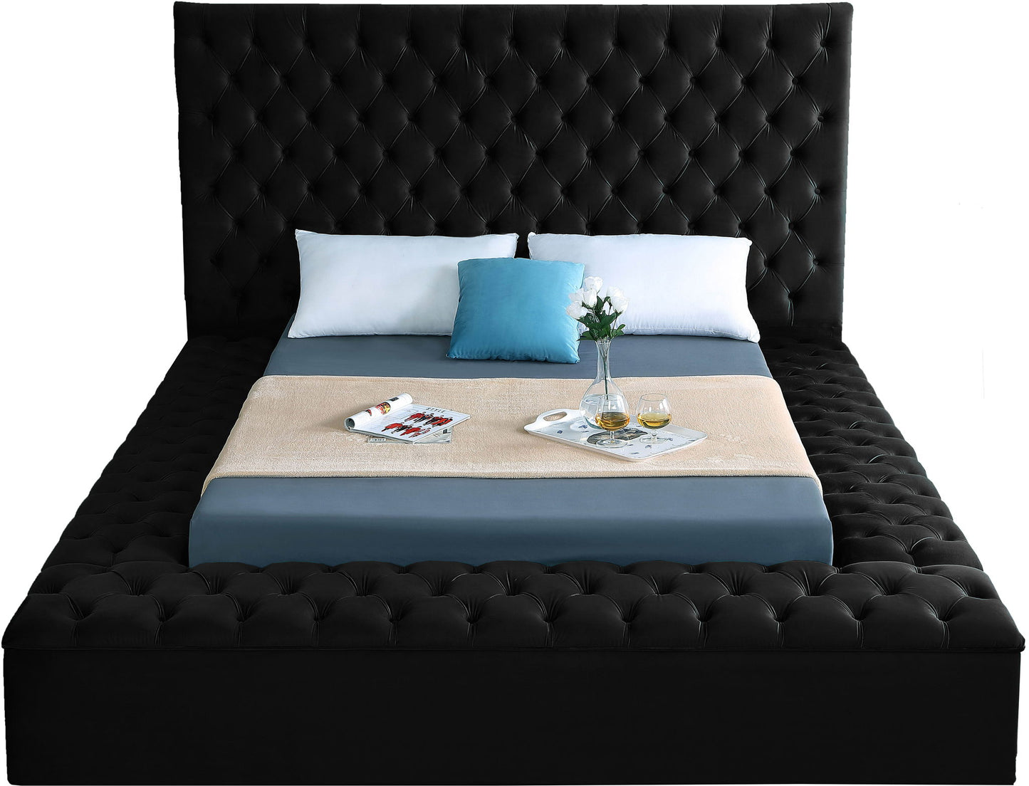 Extend elegance to the bedroom with this Bliss velvet bed. This bed has a rich look, with deeply tufted upholstery along its upper platform perimeter and headboard, ensuring that it is a good fit in modern bedroom themes. Storage rails and footboard are included to ensure maximum versatility, and the bed comes with slats, so you can use it without a box spring. The velvet fabric used in its design makes it easy to integrate alongside other furnishings.