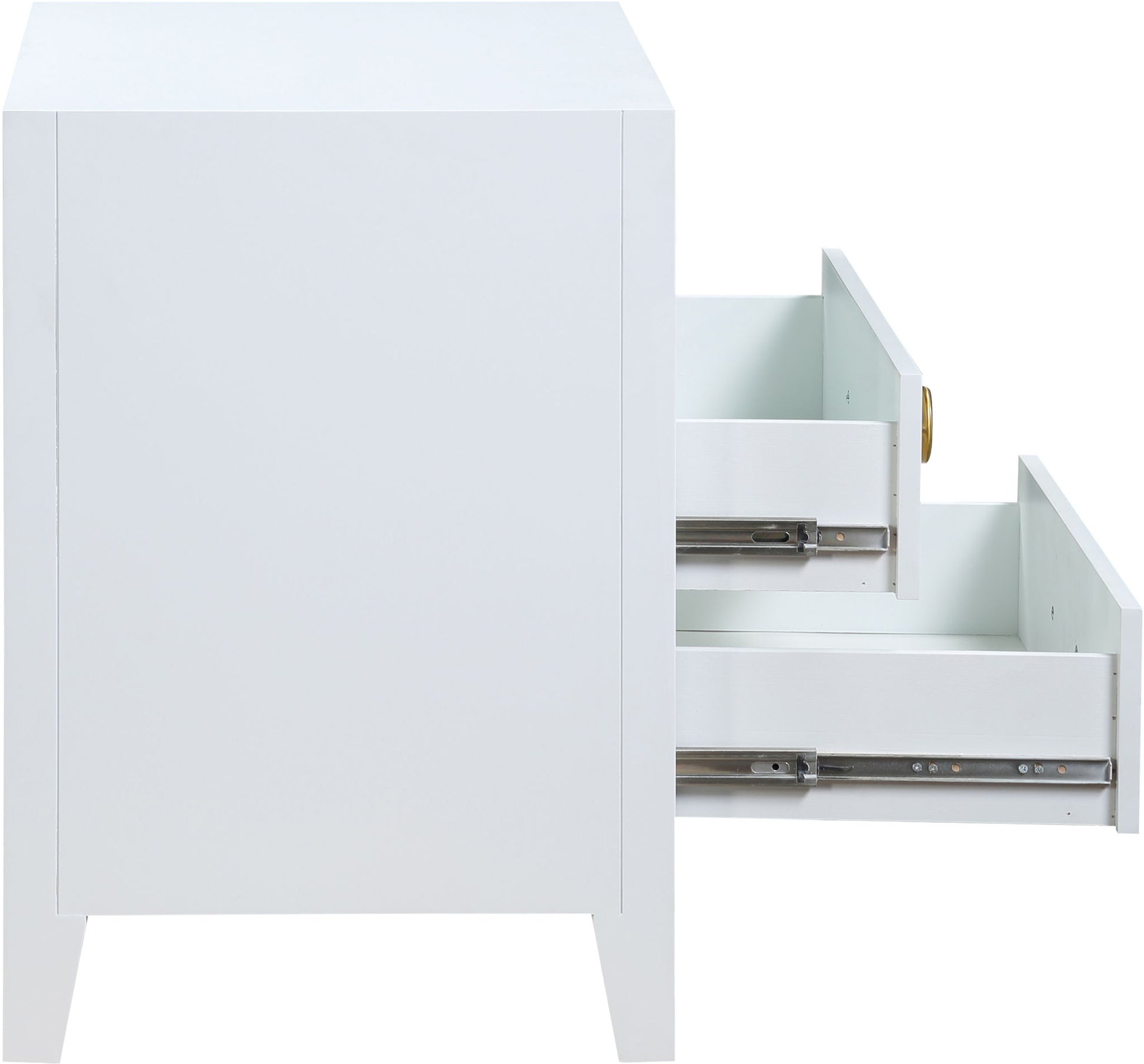 Bring unique elegance to your bedroom with this Bowtie night stand from Meridian Furniture. This night stand features two drawers and a shelf, providing you with plenty of storage space for clothes, linens, or miscellaneous objects. Its light pink color adds a touch of femininity to your living space, and its brushed bow tie handles complement your existing decor. Its flat top is perfect for placing a lamp, framed picture, books, bric-a-brac, and more.