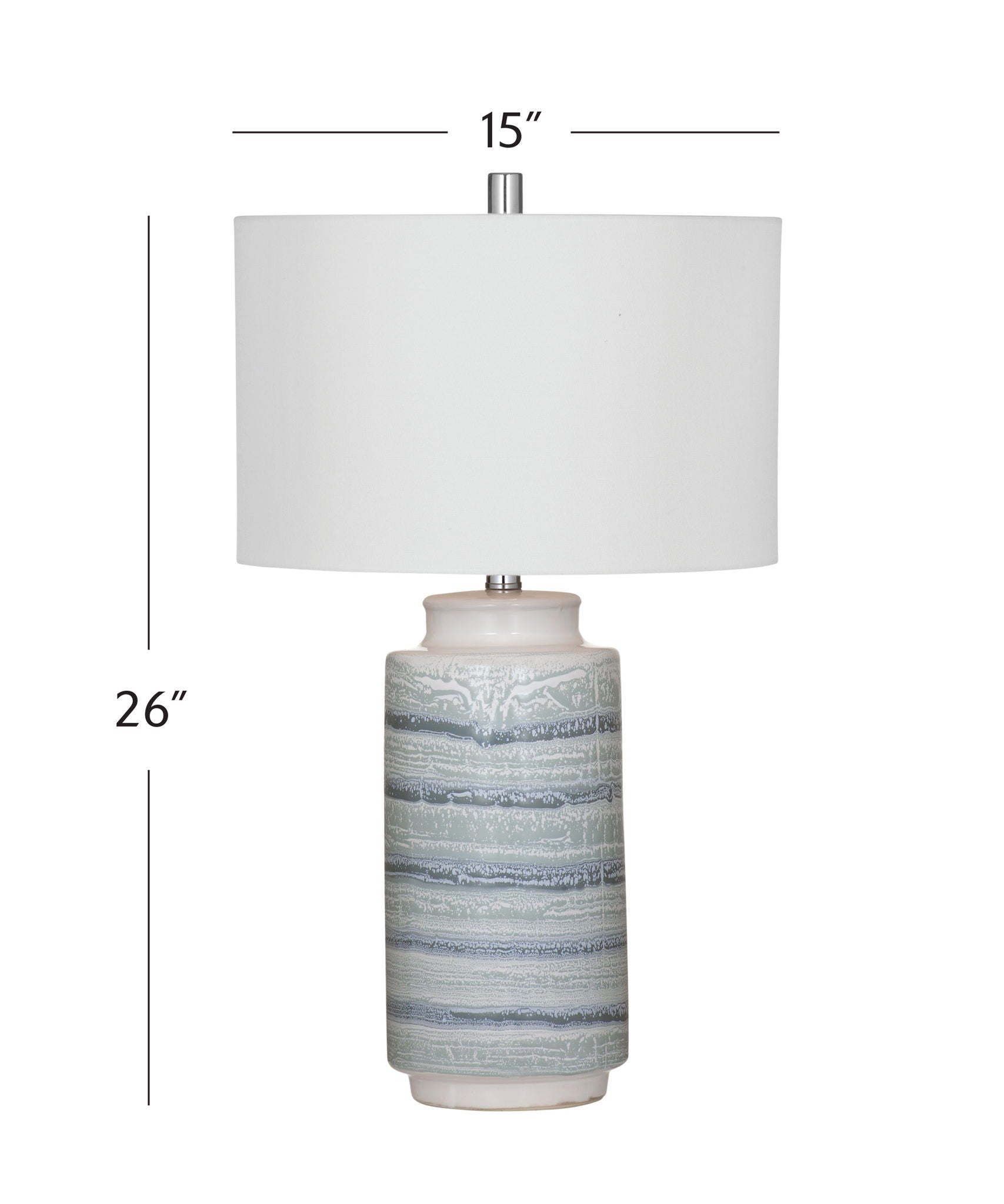 The Brizi Table Lamp combines cream and blue ceramic for a charming coastal-inspired design. Topped with a white drum shade, it radiates a modern aesthetic that effortlessly complements any interior. Its soothing hues and sleek silhouette evoke a sense of tranquility and sophistication, making it an ideal choice for any space.
