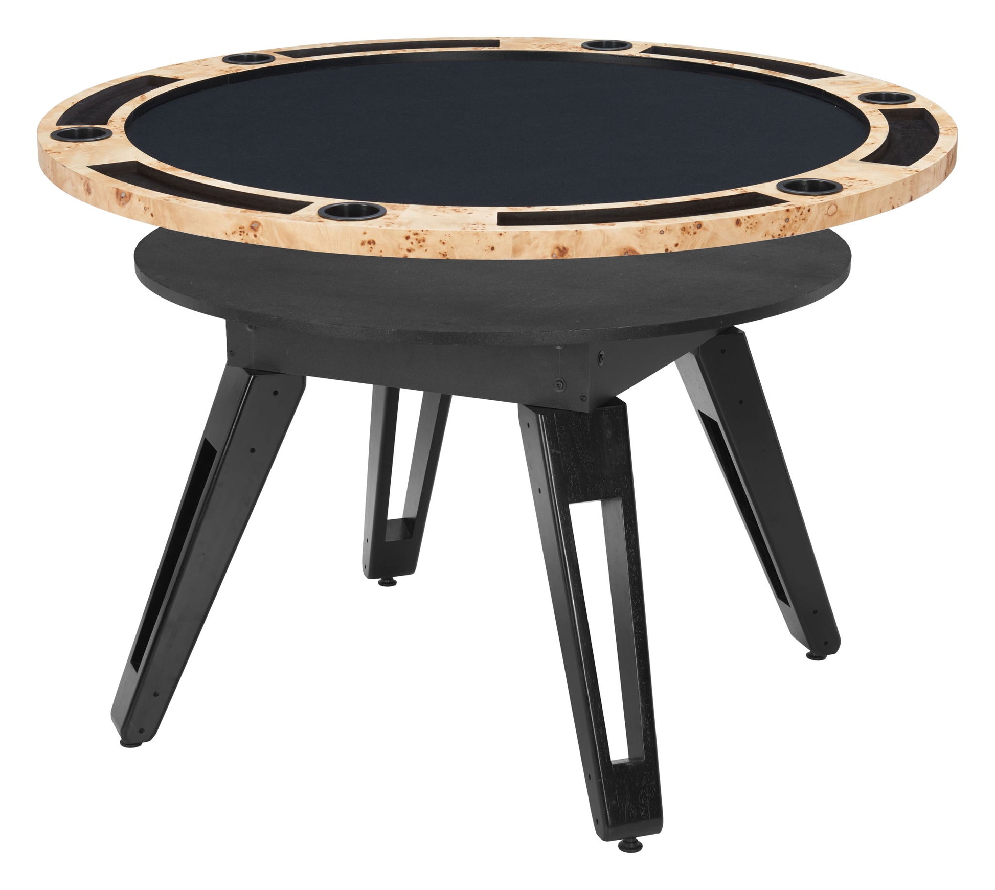 The Burl Dining/Game table has a burl wood laminate top with painted solid wood legs. This convertible table is versatile and stylish at the same with a beautiful burl look on one side and a soft felt surface with inlaid storage on the other. Liven up any multipurpose space with this cool table.