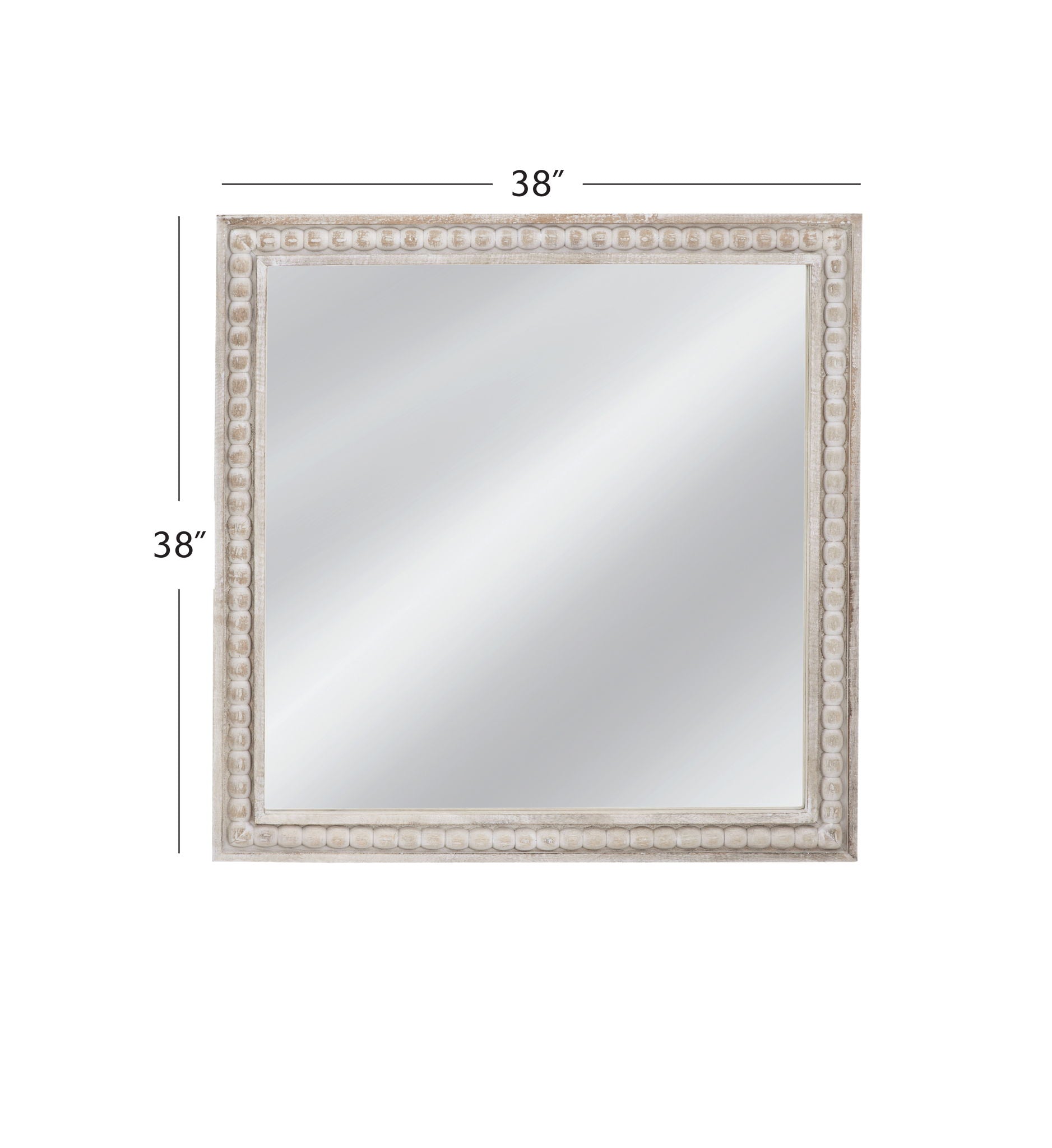 The Cappi Wall Mirror combines coastal and farmhouse vibes with its square shape and charming rounded details adorning the inside of the molding, all finished in a soothing white washed hue. Its timeless design effortlessly complements various decor styles, adding a touch of coastal warmth to any room. Crafted from high-quality wood, this mirror promises durability and style for your home decor needs.