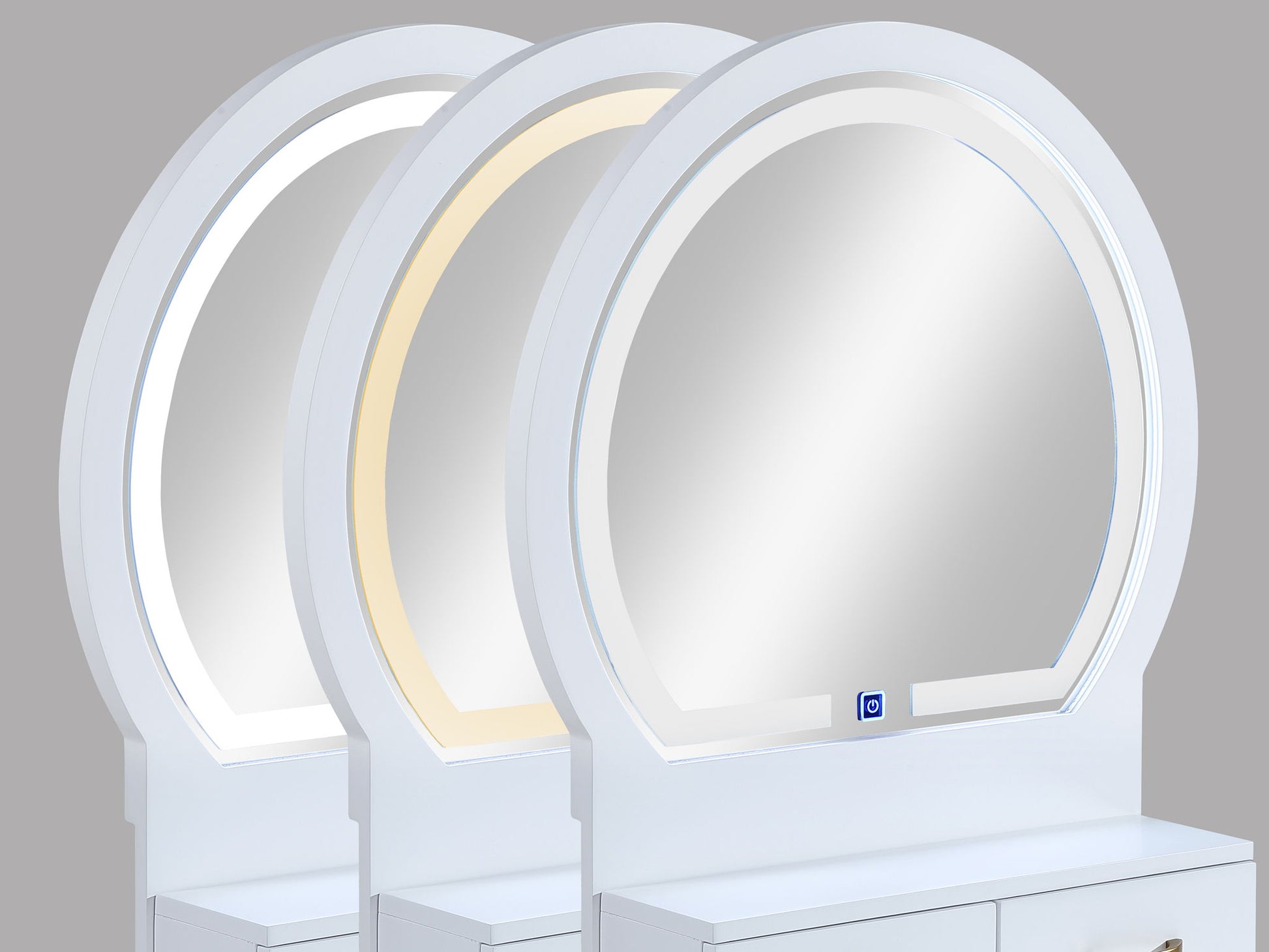 Create a chic and functional centerpiece for your bedroom or dressing area with this elegant vanity set. The sleek finish exudes modern sophistication, while the accented handles add a touch of luxury. The built-in LED-lit mirror provides optimal lighting for flawless makeup application or grooming, creating a glamorous and practical space. With spacious drawers and an upper shelf, it offers ample storage to keep your beauty essentials organized and within easy reach. The matching cushioned stool ensures comfort and style, perfectly complementing the overall design. This set combines functionality with aesthetic appeal, making it the ultimate addition to any stylish home.