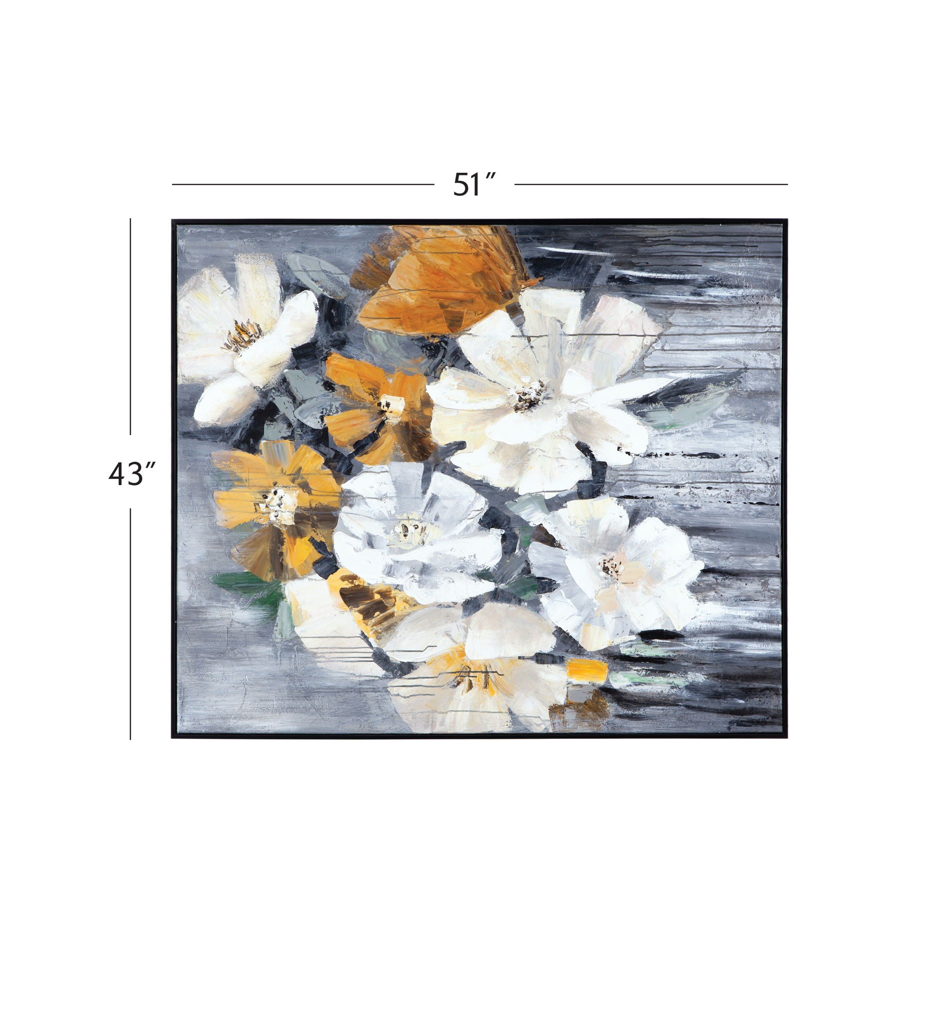 - Bold black frame contrasts delicacy of flowers and anchors the artwork in contemporary design