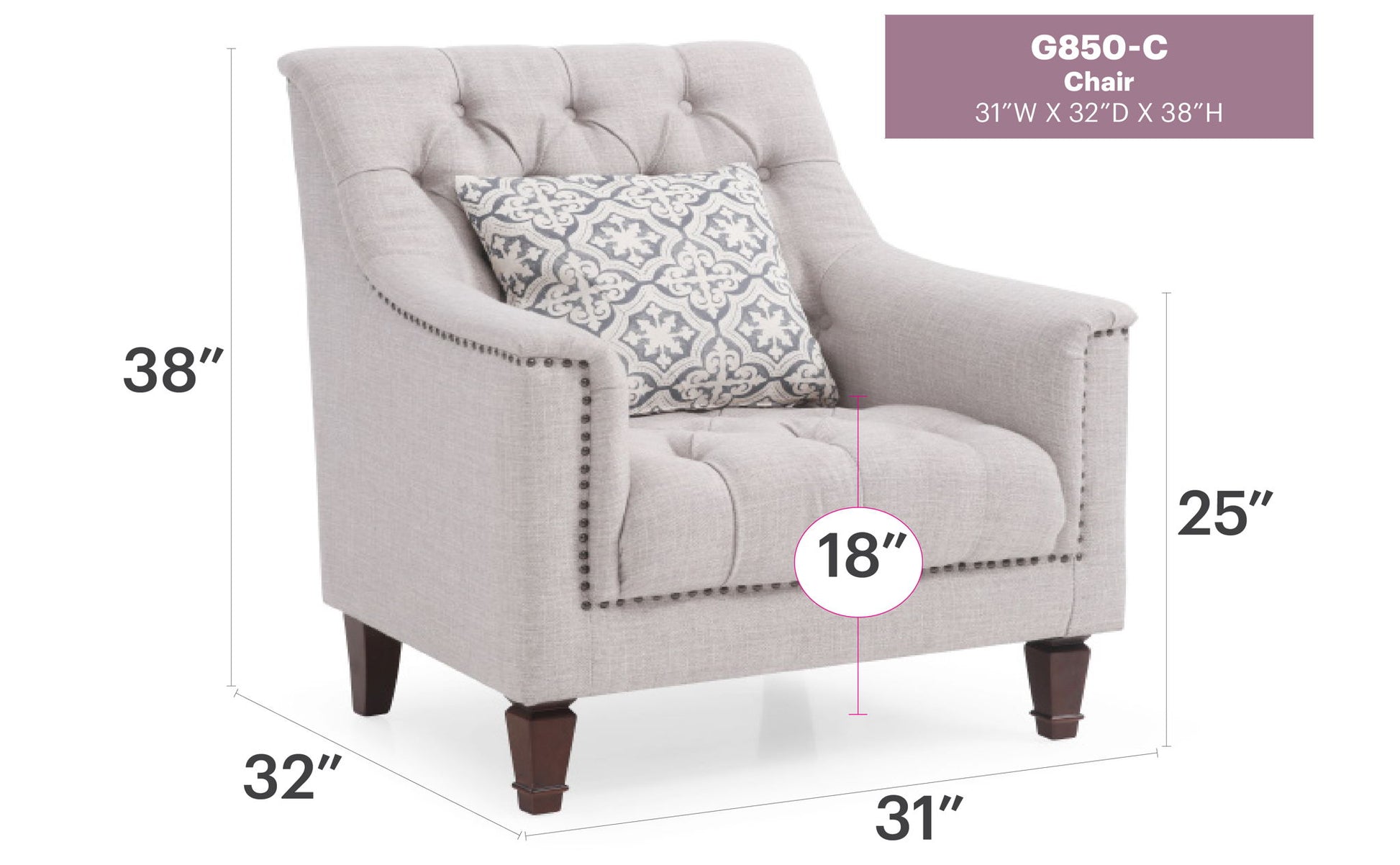 Introducing the G850-C chair from Glory Furniture, a remarkable blend of traditional and modern design elements. This chair features a lovely light gray fabric that seamlessly integrates with a variety of interior styles, making it a versatile addition to any room. The deep tufted fabric on both the inside back and seat not only enhances its visual appeal but also invites you to sink into comfort. Intriguingly adorned with antiqued nail heads, this chair brings a classic charm that draws the eye and sparks conversation. The thoughtfully crafted wood legs provide exceptional strength and stability, ensuring this chair is as functional as it is beautiful. With overall dimensions of 37 inches in height, 31 inches in width, and 31 inches in depth, this chair is designed to fit comfortably in smaller living areas or larger spaces. The included coordinated throw pillows complete the aesthetic, inviting you to experience relaxation and style all in one. This exceptional piece is not only a chair but also a statement for your home.