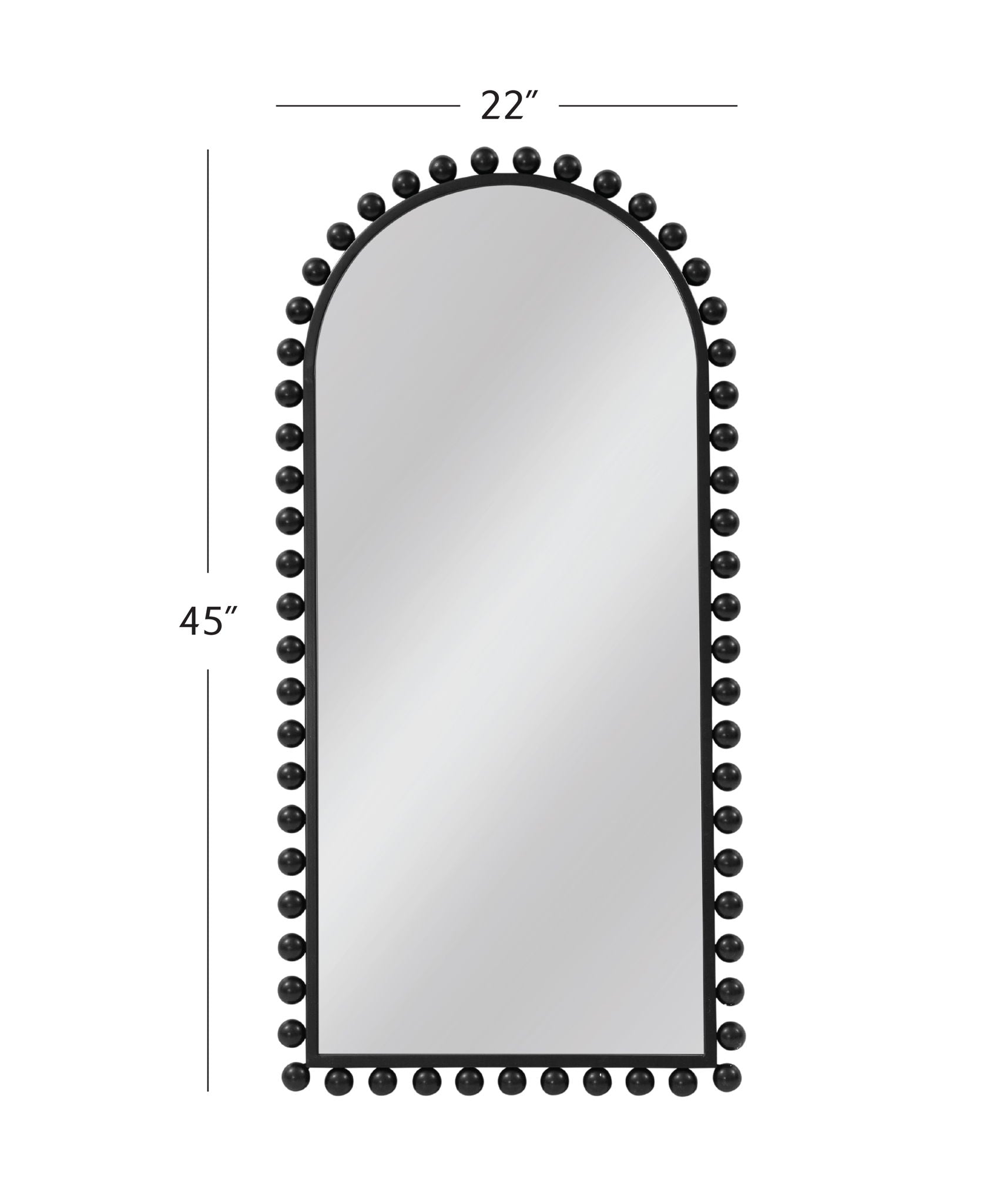 The Claria Wall Mirror features a distinctive arched frame adorned with a series of black beads, adding a bohemian twist to its modern style. The playful arrangement of the beads around the perimeter infuses a textural and visual interest that complements the mirror's sleek, curved top. This piece merges the relaxed vibe of boho decor with the clean lines of modern design, making it a versatile and striking addition to any contemporary space seeking a touch of whimsy.
