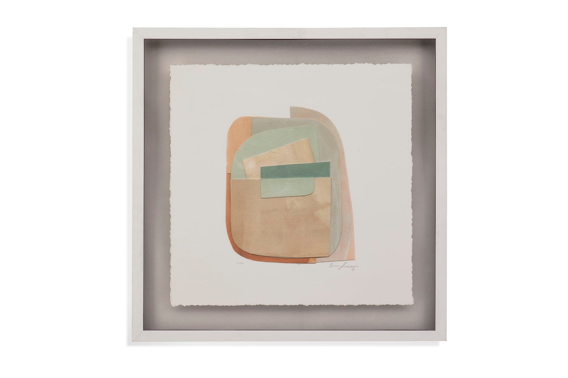 Color Structure II features abstract shapes in pastel greens, blues and peach mounted to simulate floating print in a simple shadowbox frame.