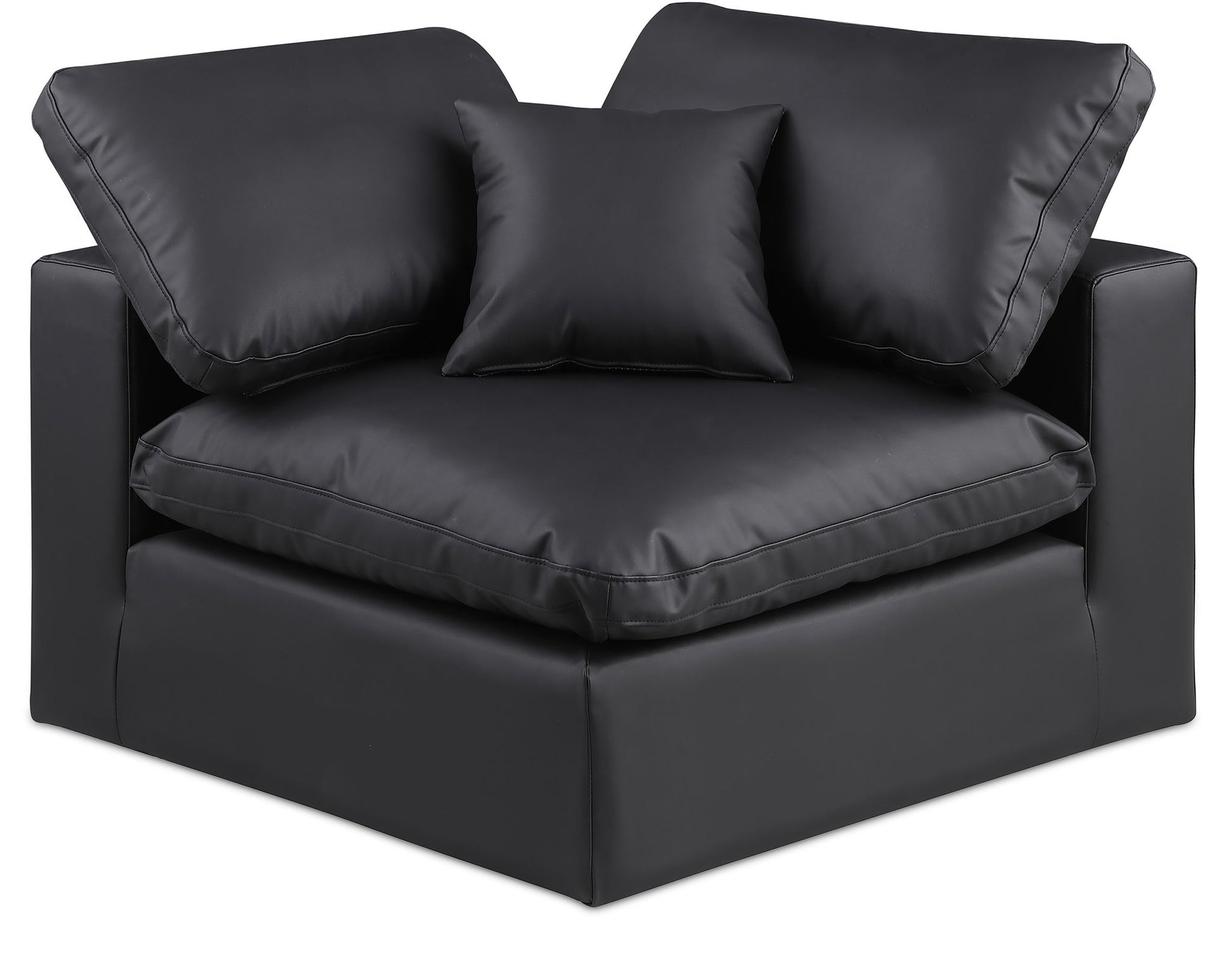 Give your space a whole new look with this Comfy vegan leather corner chair. This handsome chair fits nicely with other items in the Comfy collection and is a versatile seating option designed for adaptability, comfort and style. Wrapped in rich durable vegan leathered upholstery, this chair offers a plush embrace of overstuffed down feather cushions, carefully crafted to deliver the highest level of comfort. The perfect seat for creating an oasis for relaxation, this chair has thick foam surrounding its frame for added support and coziness.