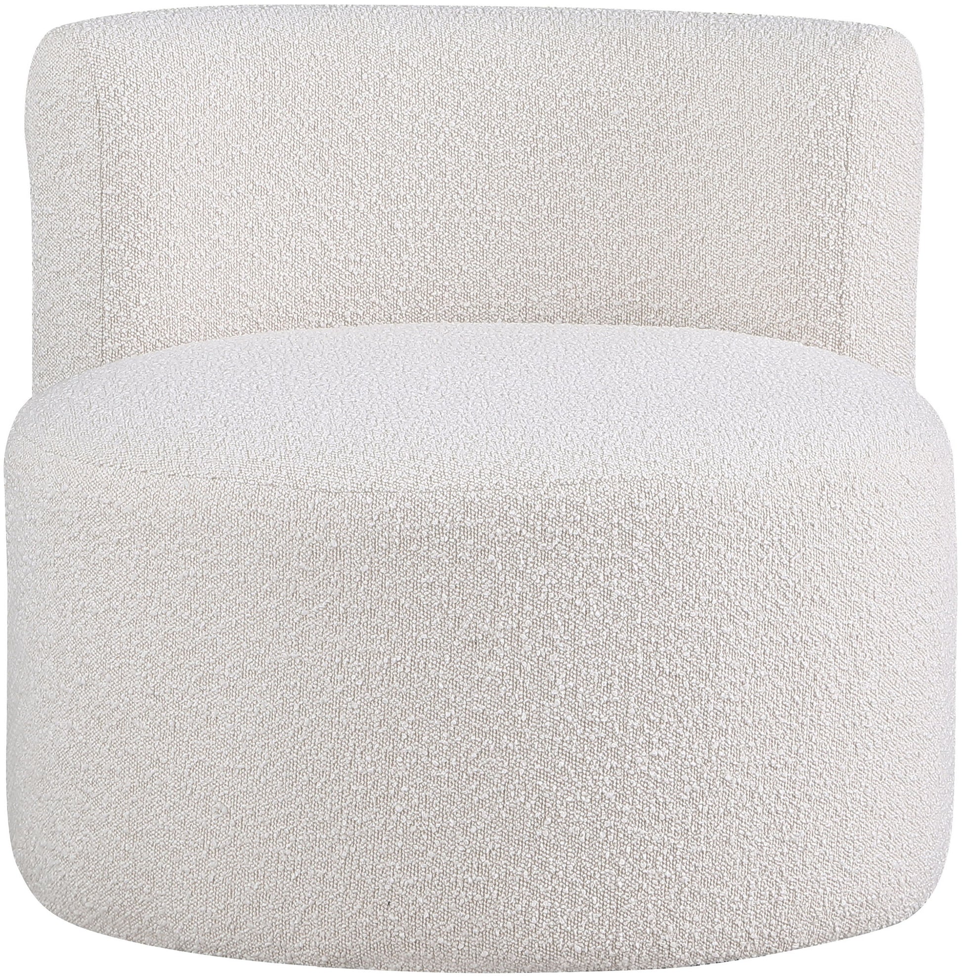 Give your home a new conversation piece with this Como cream boucle fabric accent chair. Its contemporary design is sure to catch eyes whenever you have visitors. Its round seat provides a comfortable place to sit, and a curved back allows you to settle back and relax. Its rich cream boucle fabric upholstery paired with a foam cushion makes this accent chair soft, and its wooden frame ensures that this chair will last for years to come.