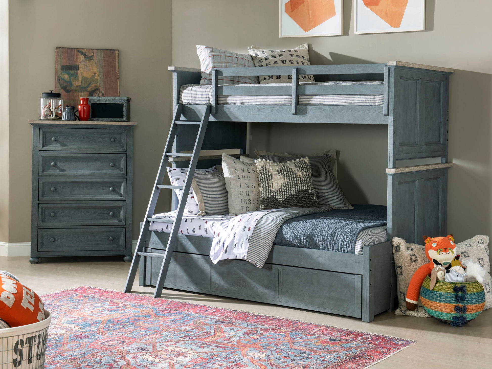 Beautifully crafted and versatile,, Cone Mills is a country inspired bedroom collection offering several options for sleep,, study and storage. Rustic finishes,, clean lines,, heavy framed drawer fronts,, ball feet and thick tops combine to create a substantial feel with a cozy and relaxed tone. The Distressed Denim finish on frames and hardware,, along with the Stone Washed tops add subtle contrast and elevates the timeless styling.