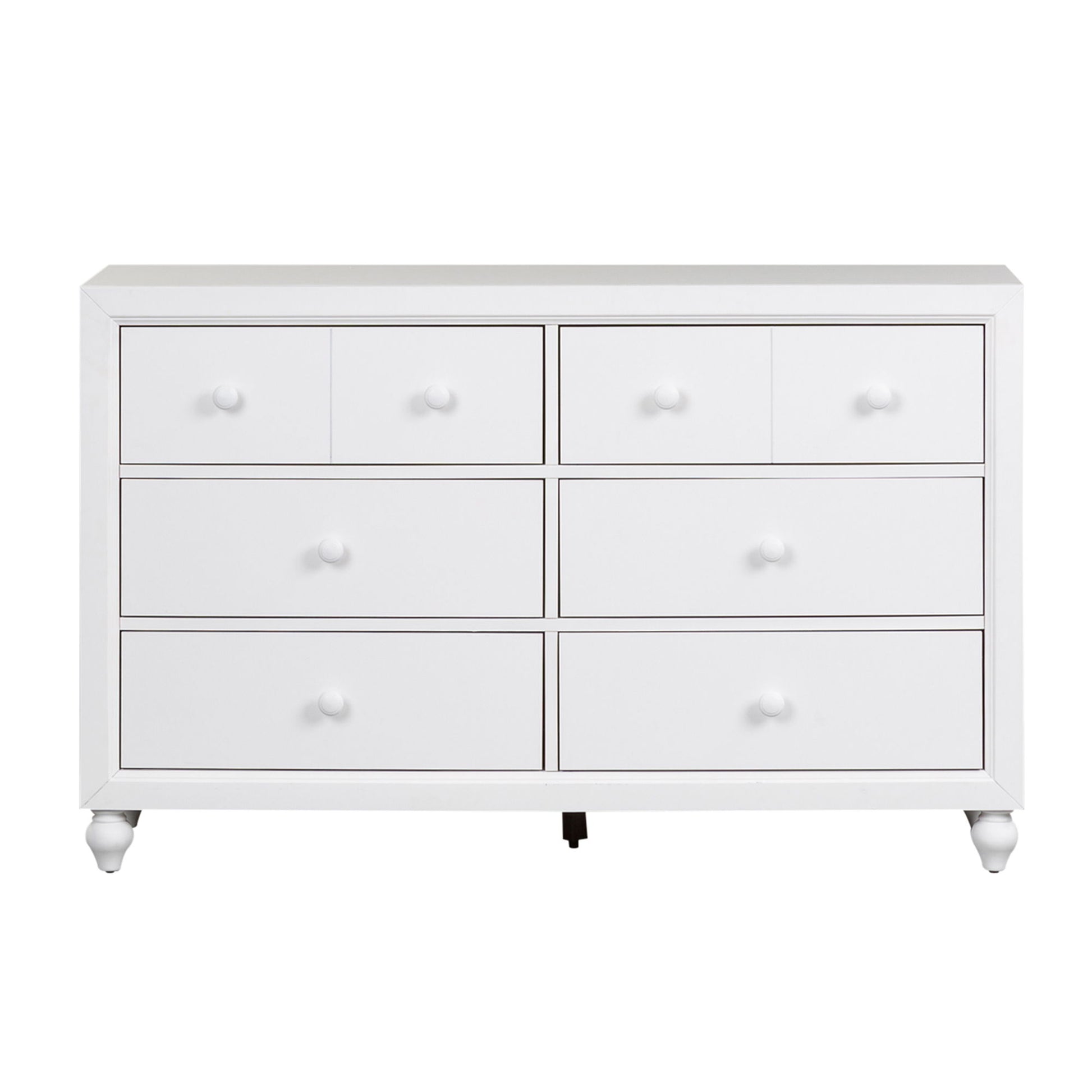 Indulge in cottage design with the Cottage View 6 drawer dresser. Crafted by melamine and a rubberwood solid frame, this piece features kenlin drawer glides, bottom case dust proofing, solid wood picture frame moldings, laminate drawer interior, bluff cut top drawers, accented by wooden knob hardware and anchored by bun feet. This piece is offered in an alternate finish, and the melamine is scratch resistant, sure to make this piece last in any home.