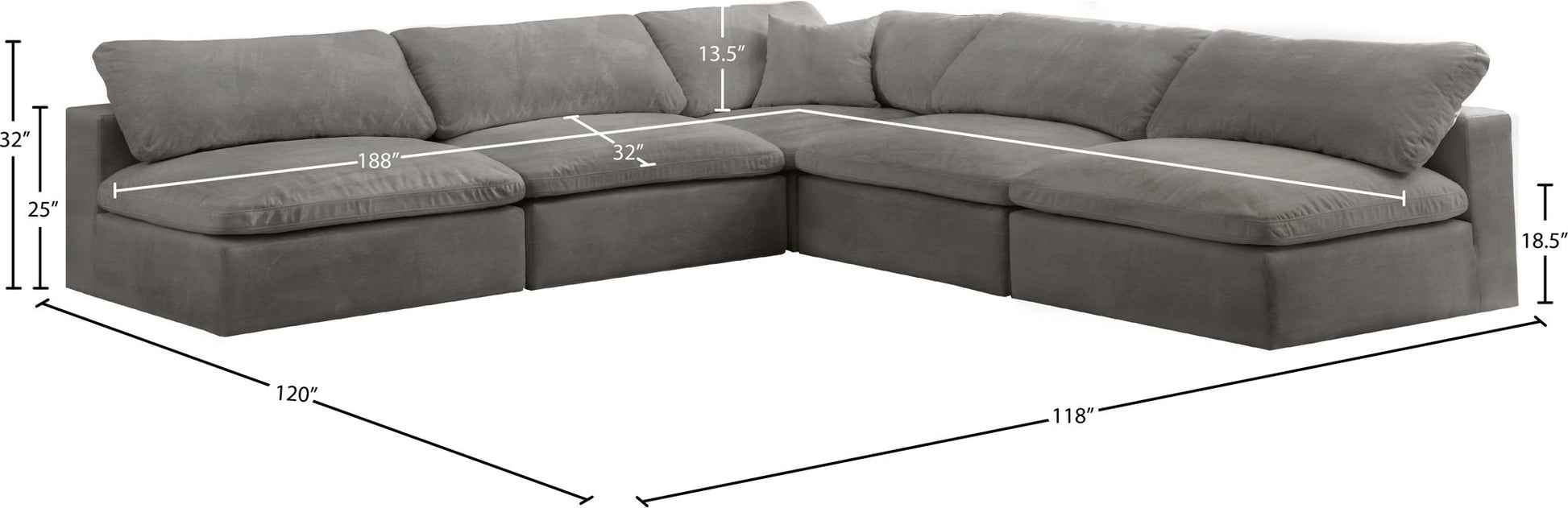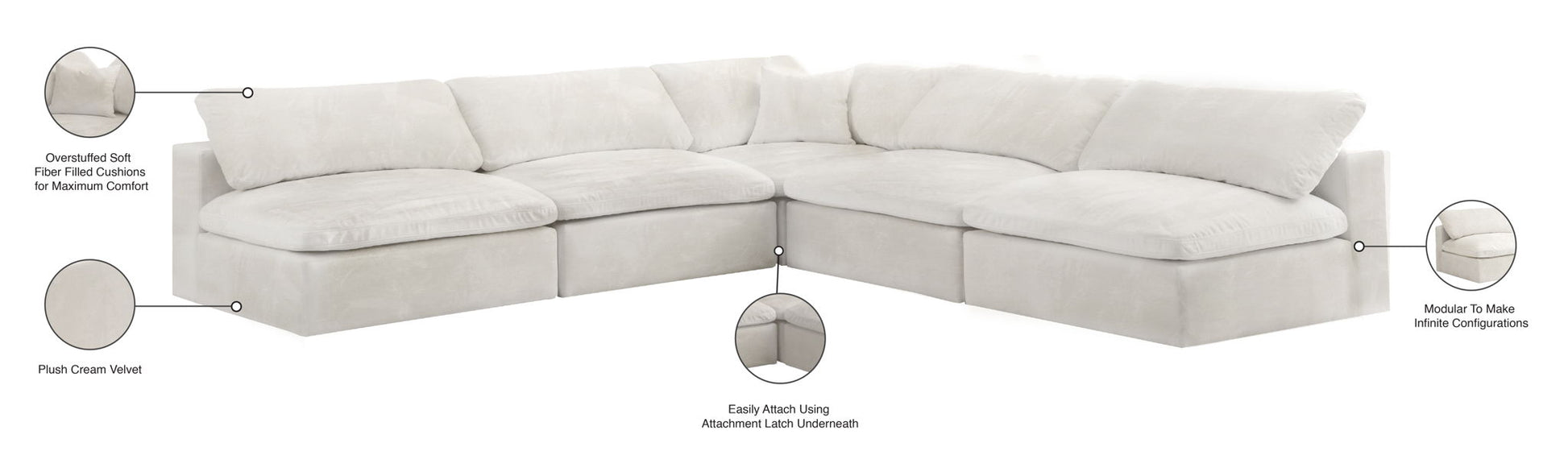 Bring home this Cozy 5-piece sectional for a fresh new look. Embrace casual elegance with this Cozy velvet cloud-like comfort modular fiber-filled seating option. Handsome from all angles, this piece features soft velvet upholstery to make it an easy fit in any room. This modular piece can be combined with other items in the Cozy collection to create a seating group of your dreams. The cushions on this piece are exceptionally comfortableand filled with fiber for luxury that you deserve as you rest and relax.