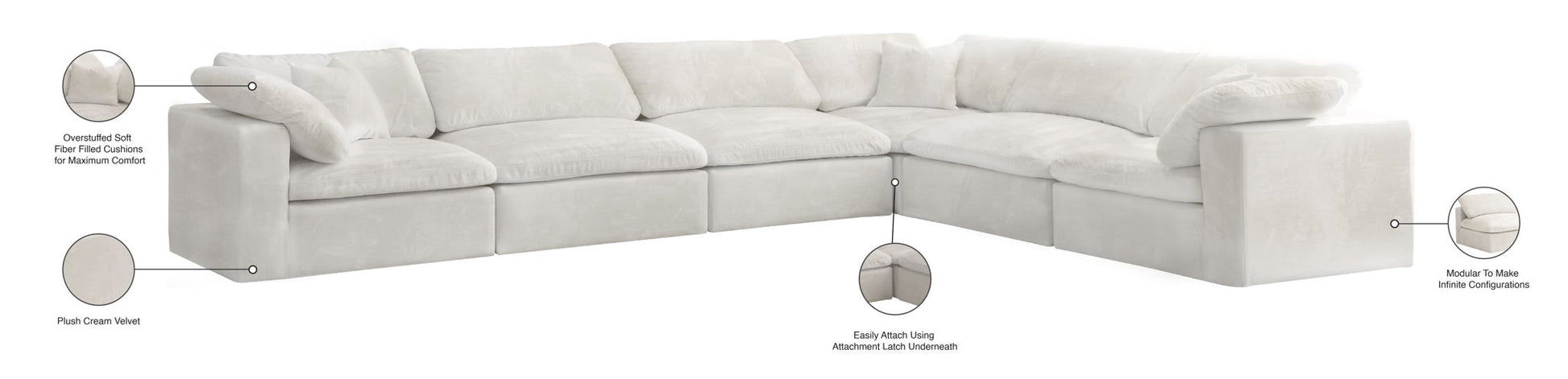 Bring home this Cozy 6-piece sectional for a fresh new look. Embrace casual elegance with this Cozy velvet cloud-like comfort modular fiber-filled seating option. Handsome from all angles, this piece features soft velvet upholstery to make it an easy fit in any room. This modular piece can be combined with other items in the Cozy collection to create a seating group of your dreams. The cushions on this piece are exceptionally comfortableand filled with fiber for luxury that you deserve as you rest and relax.