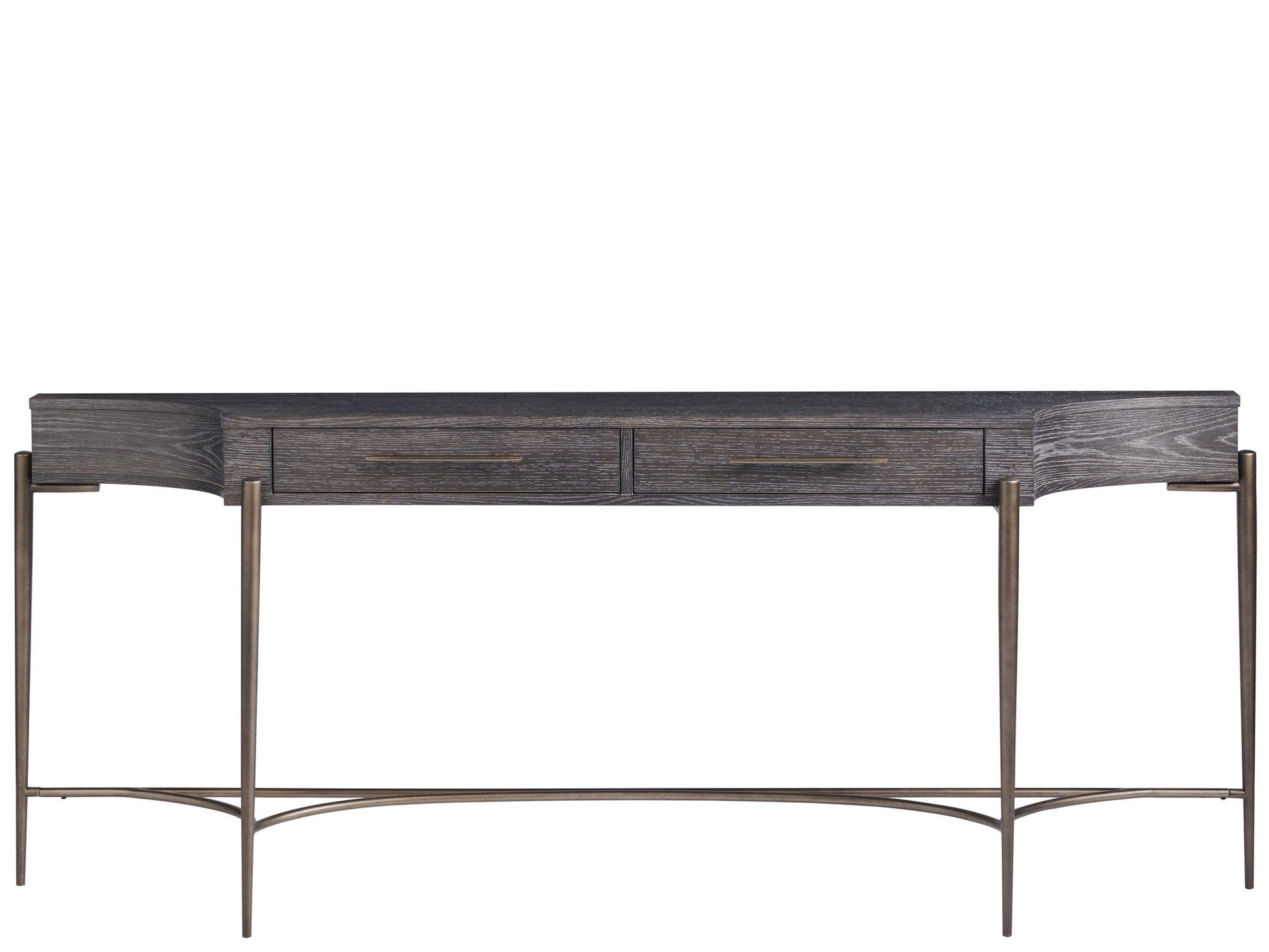 The Oslo Console Table introduces an airy, mid-century aesthetic into spaces, featuring a long, narrow body supported by tall, stately bronzed legs.