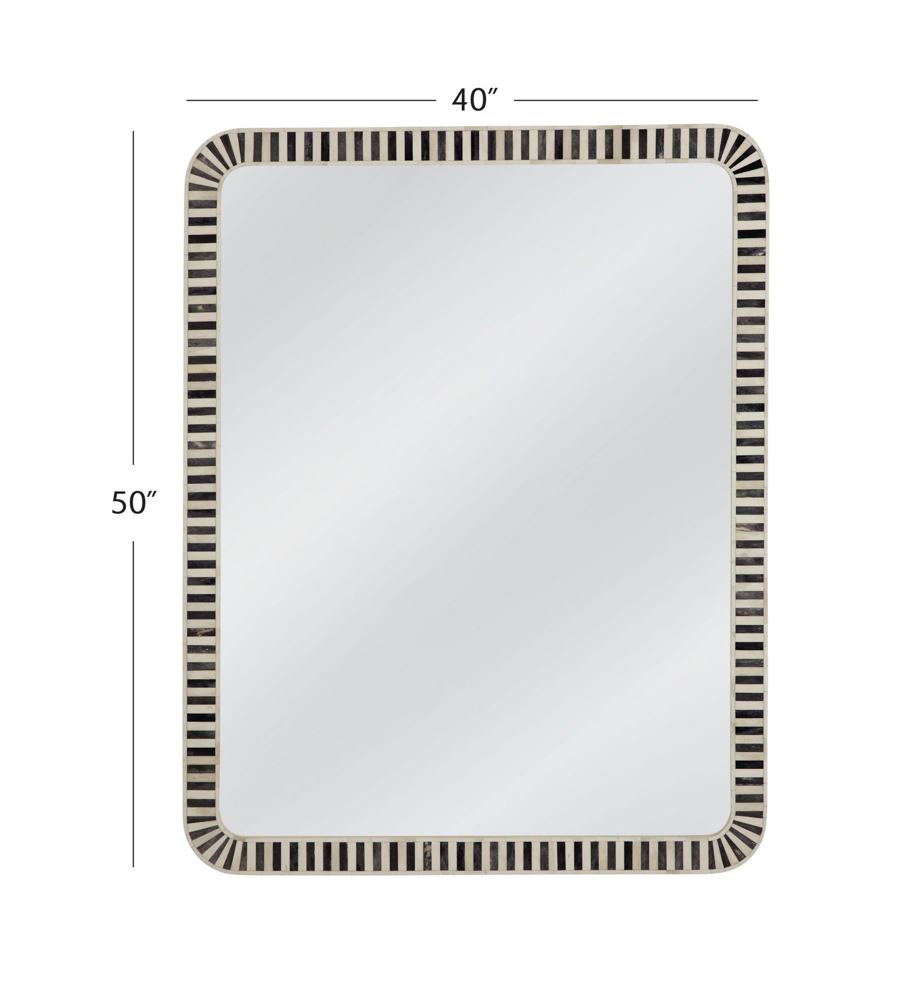 The Cyrus Wall Mirror presents a sleek and modern design, featuring a rectangular shape with rounded corners. Its chic black frame paired with cream and gray bone accents exudes contemporary elegance, making it a sophisticated addition to any living space. Crafted with attention to detail, this mirror effortlessly enhances your home decor with its minimalist yet stylish appeal.