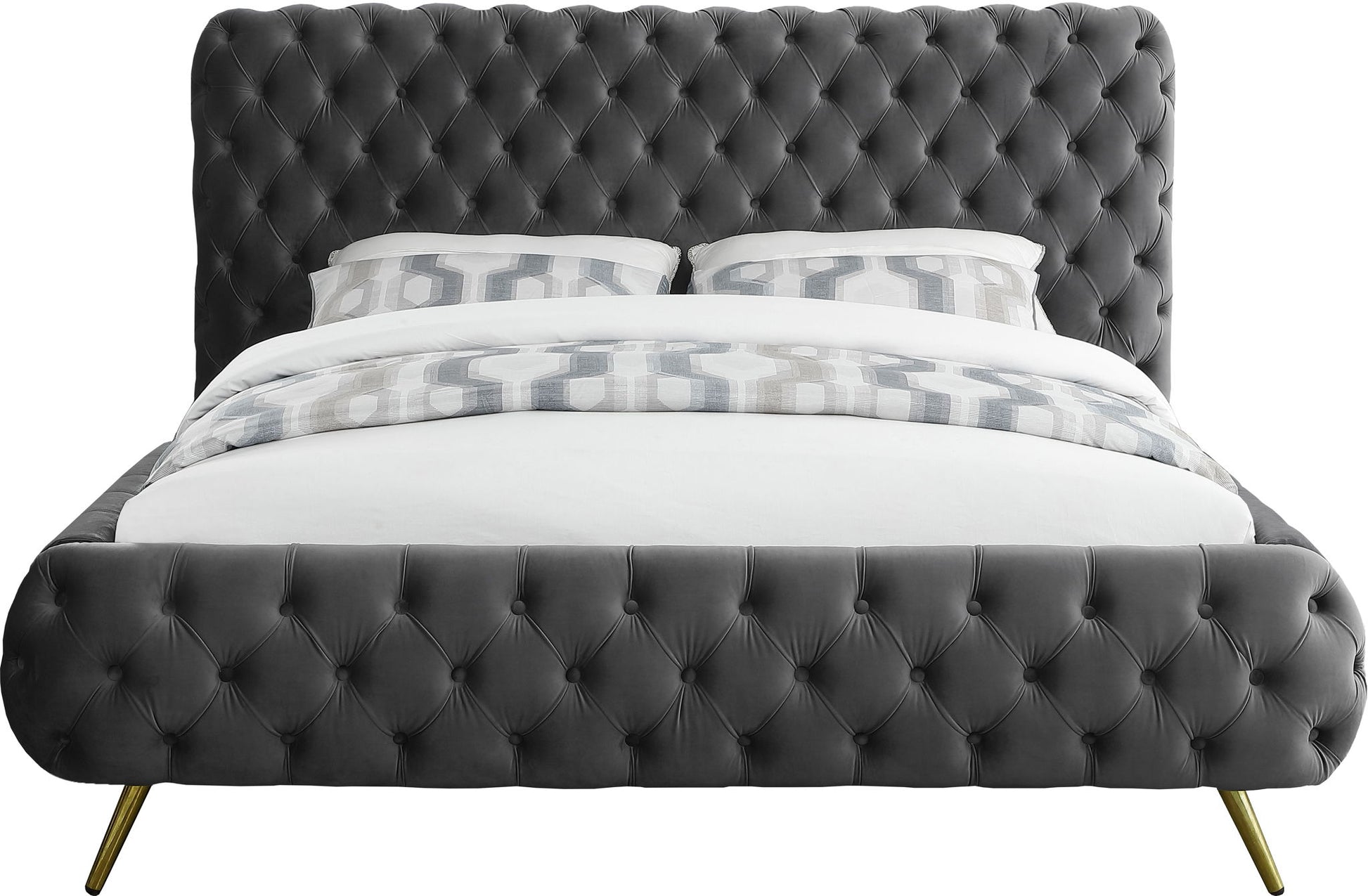 Surround yourself in modern luxury when you add this Delano Bed to your bedroom oasis. Sumptuous by design, this bed features all-over button tufting for a look that is nothing short of stunning. This dimensional bed features a heavily padded headboard and side rails, each covered in magnificent-to-the-touch velvet for a look that's upscale and simply divine. Metal legs on this bed allow easy clearance for vacuuming, and the bed uses just a mattress, so there's no need for a box spring or foundation, which only adds to its sleek look.