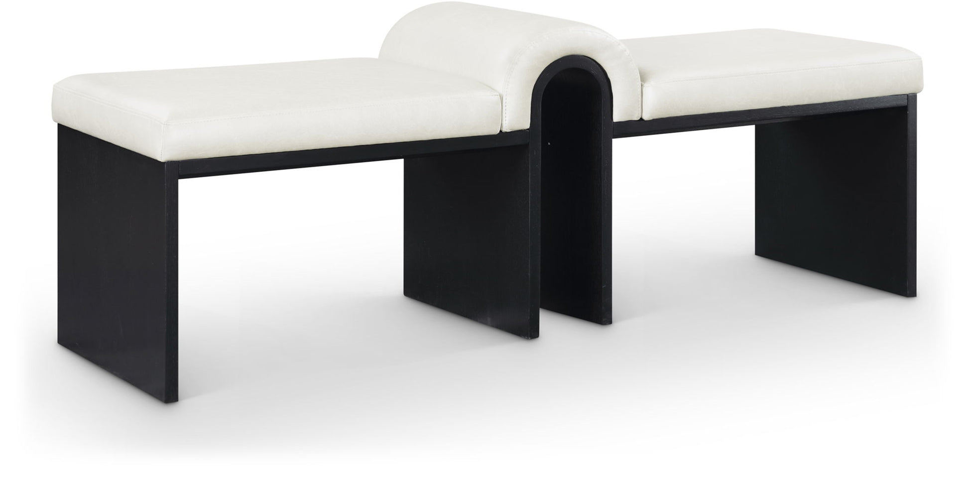 Seamlessly blending modern elegance with timeless craftsmanship, the Delphine vegan leather upholstered bench has a unique curvature to uplift any space. Upholstered in soft vegan leather, this bench offers a sleek, refined look complemented by its black finish and oak veneer base. Crafted from a mix of solid wood and MDF, its contemporary design provides both durability and style, making it a versatile statement piece.