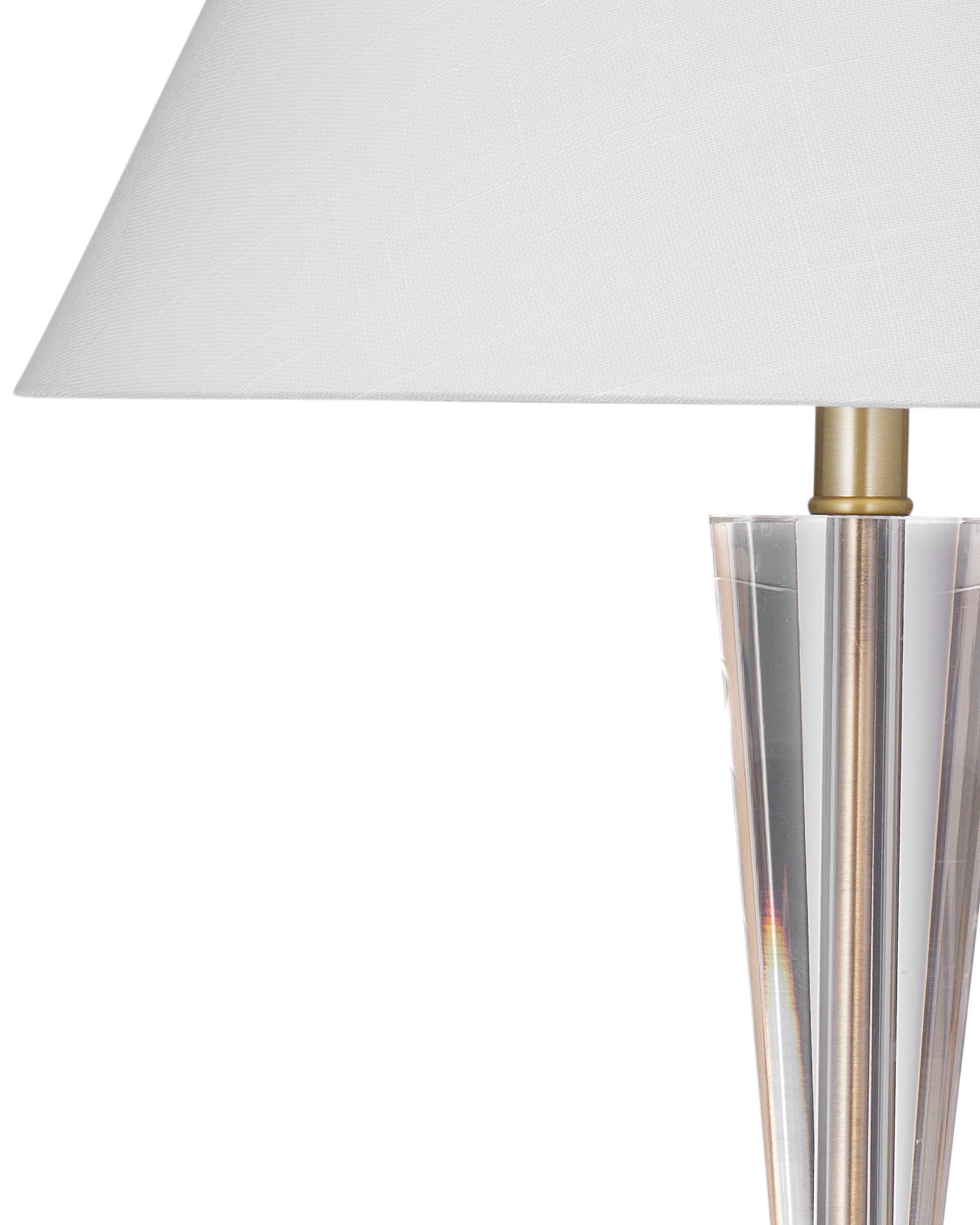The Devon Table Lamp features an elegant hourglass-shaped crystal base that adds a touch of sophistication to any room. The brass base provides a solid foundation, while the tapered white shade softens the light, creating a warm and inviting ambiance. This lamp's modern yet timeless design makes it a versatile addition to a variety of spaces, from living rooms to bedrooms or offices. With its clear crystal and polished brass details, the Devon Table Lamp blends beautifully into both contemporary and classic interiors.