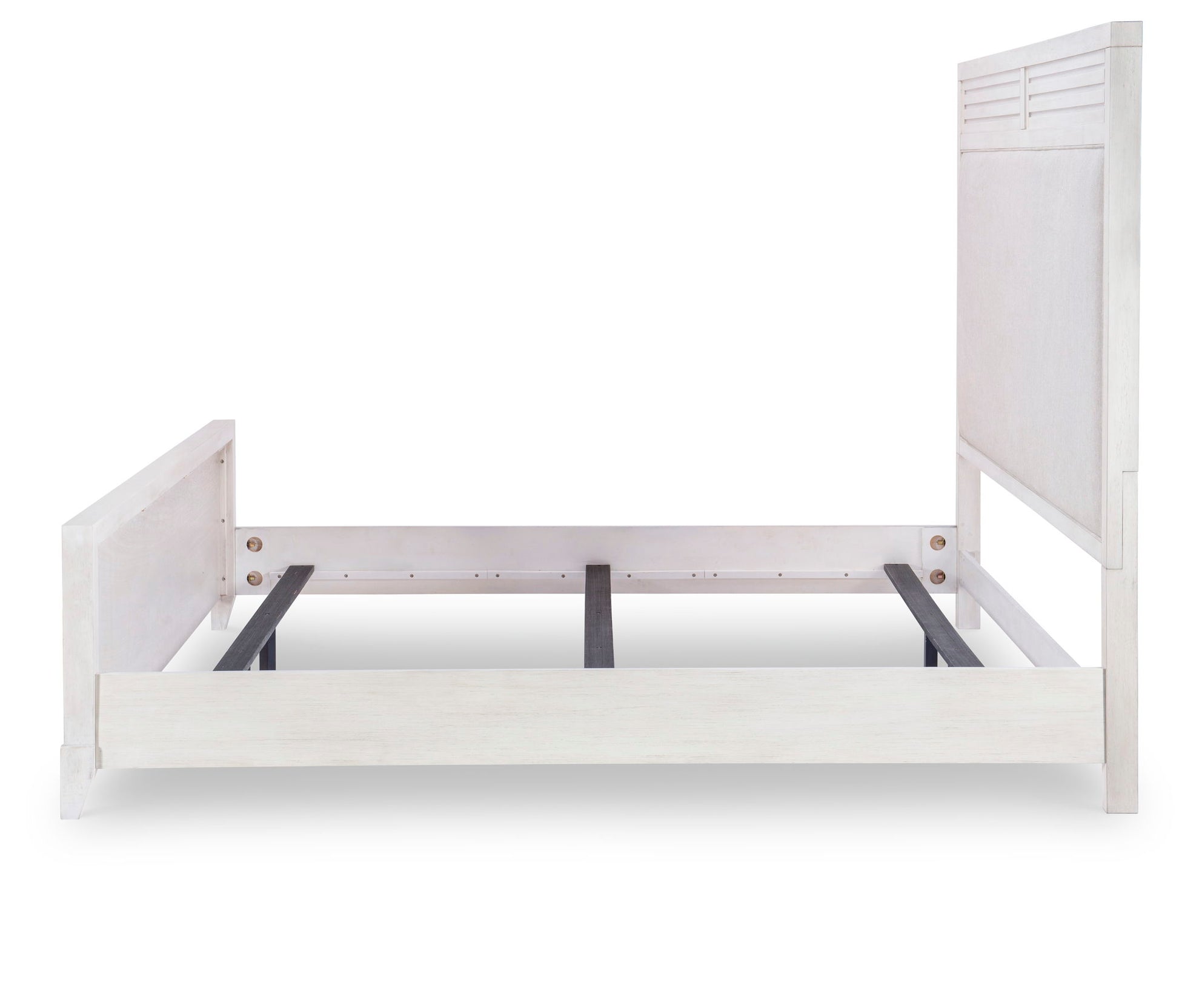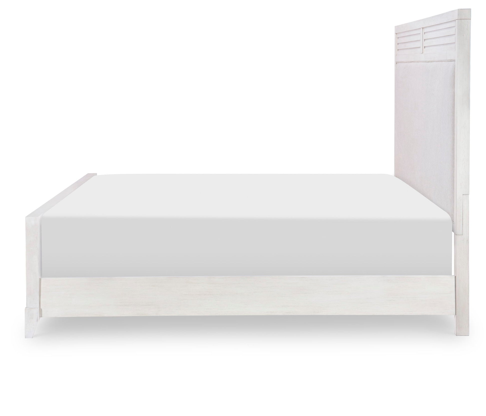 The Edgewater Upholstered Bed with Light Fabric. Natural tones, classic coastal influences, and a love of casual, come together to create the Edgewater collection. Details such as canted legs, a shutter motif on drawer fronts and bases, along with the Aged Bronze hardware, lend the perfect amount of a relaxed and livable vibe. The Sand Dollar White finish on quartered ash veneer has a slight wire brushing that draws attention to the wood grain and hang up.