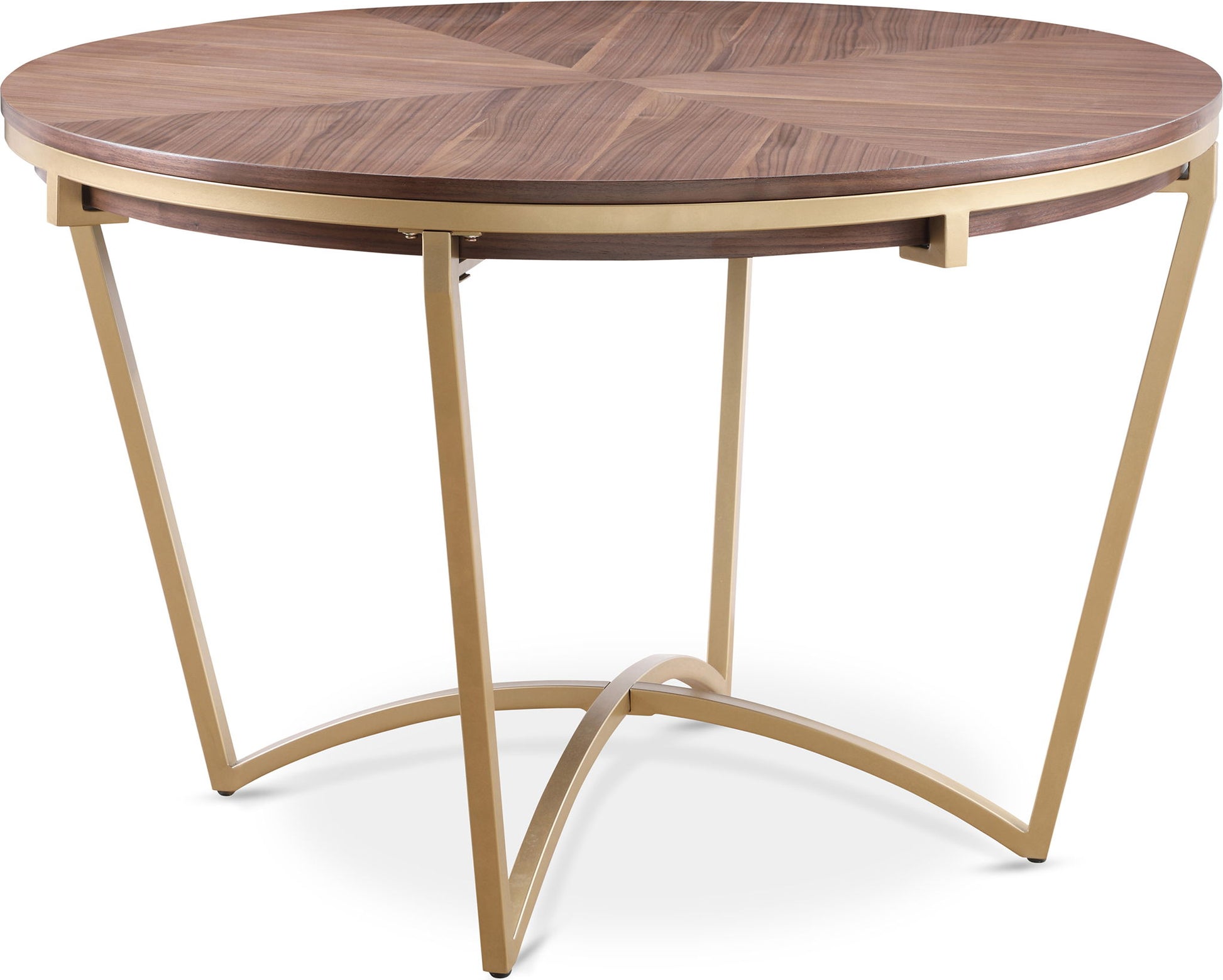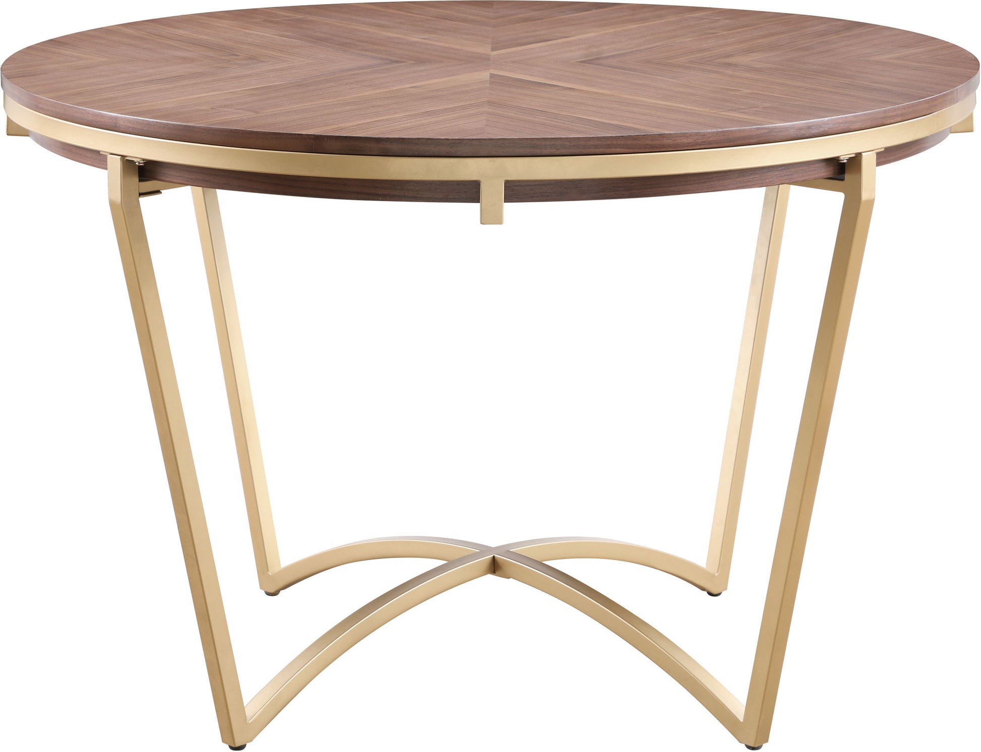Blend traditional with modern when you bring this Eleanor dining table into your space. This table catches the eye with its woodgrain natural walnut veneer top that rests sturdily on its brushed gold base. Offering legroom aplenty for your guests, this table provides a lovely contrast that is well at home in both modern and classic decor settings. Pair your favorite chairs for a look that is hard to ignore.