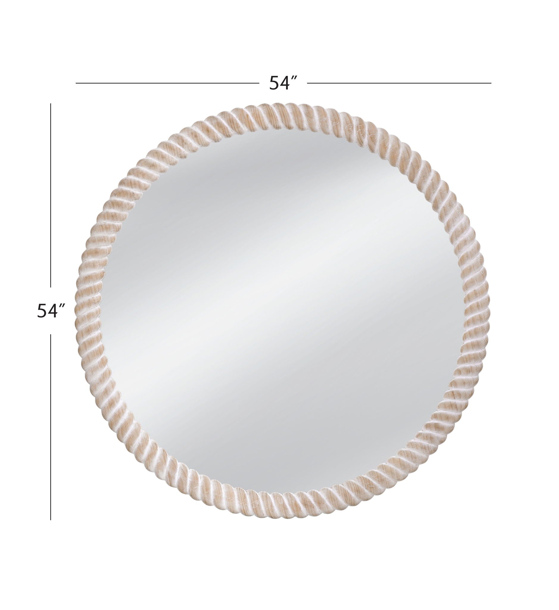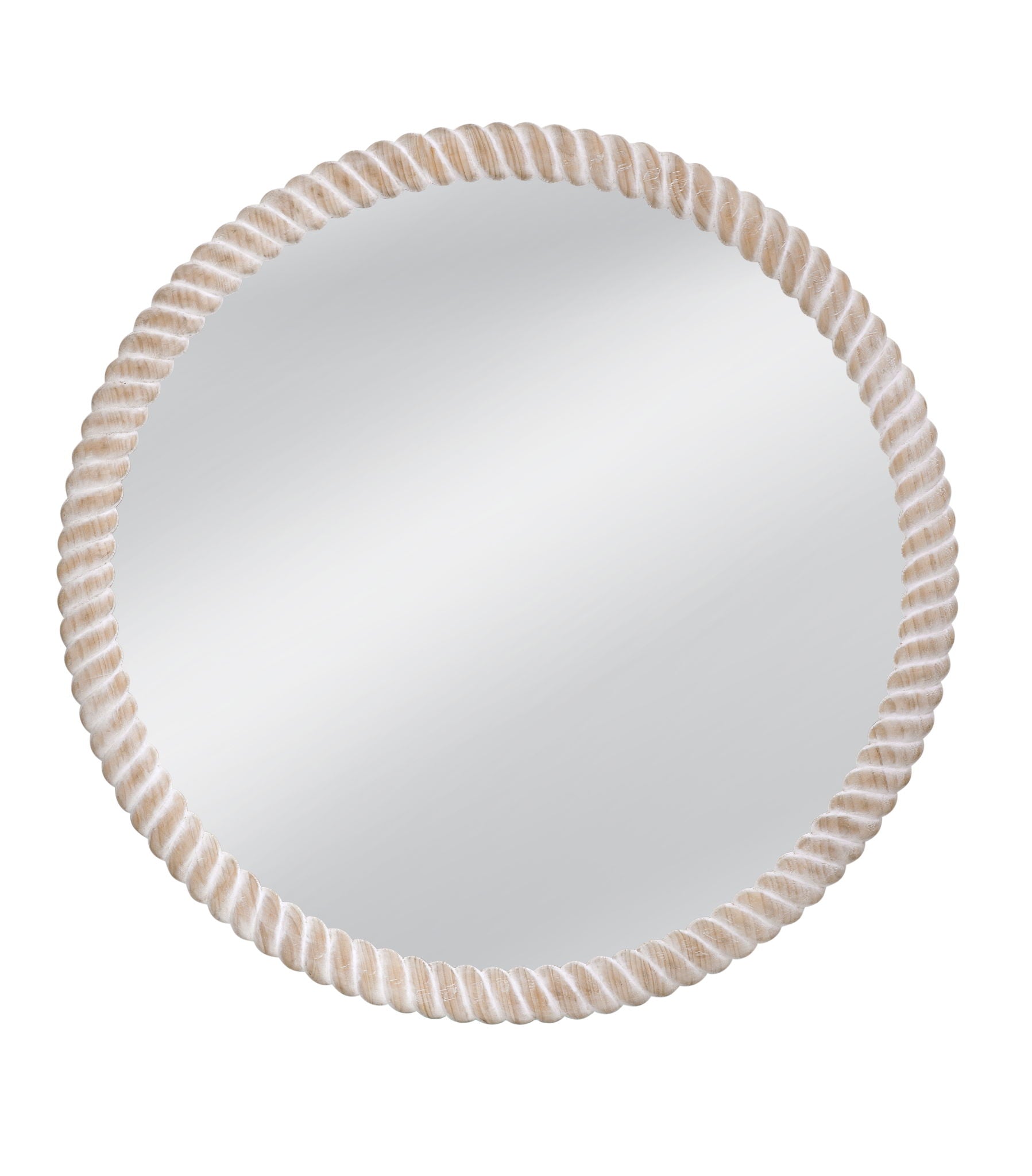 The Ely Wall Mirror boasts a charming round frame adorned with a rustic rope motif, creating a warm and inviting focal point for any room. Finished in a weathered white tone, it exudes timeless elegance while adding a touch of coastal charm to your living space. Crafted with attention to detail, this mirror effortlessly blends style and functionality to enhance your home decor with its subtle yet distinctive appeal.