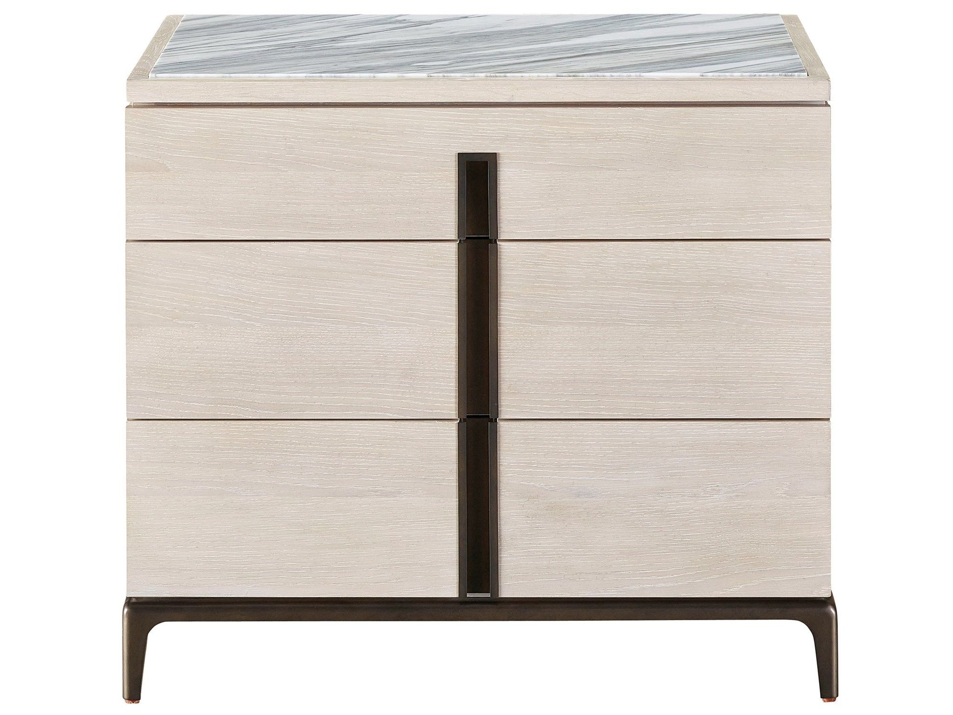 Dazzling white Calacatta marble is the star of the Maren Nightstand, complemented by soft white oak panels and accented with satin bronze hardware and base frame.