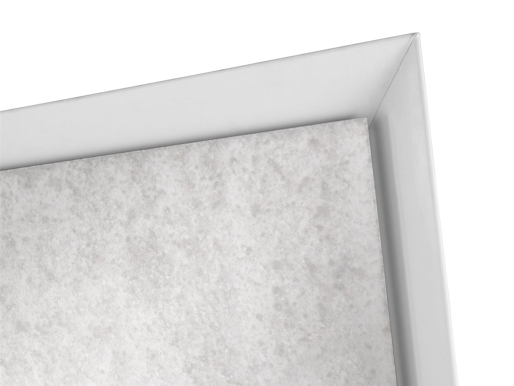 A beveled faux leather frame and floating antique mirror glass adds a clean, modern sensibility to this mirror design.