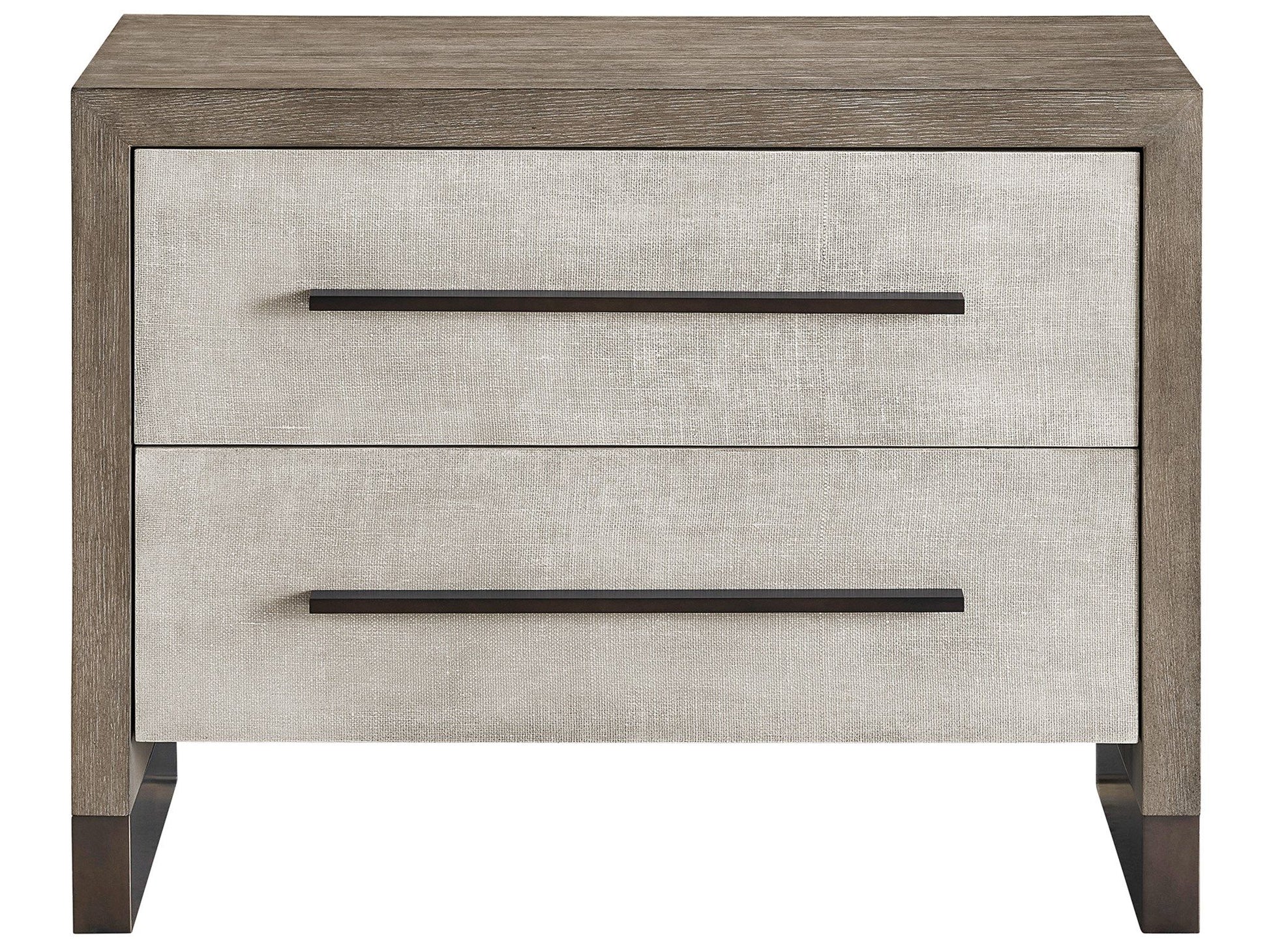 Two spacious drawers with lightly textured faux linen drawer fronts are encapsulated by a weathered oak finish and outfitted with USB ports and outlets.