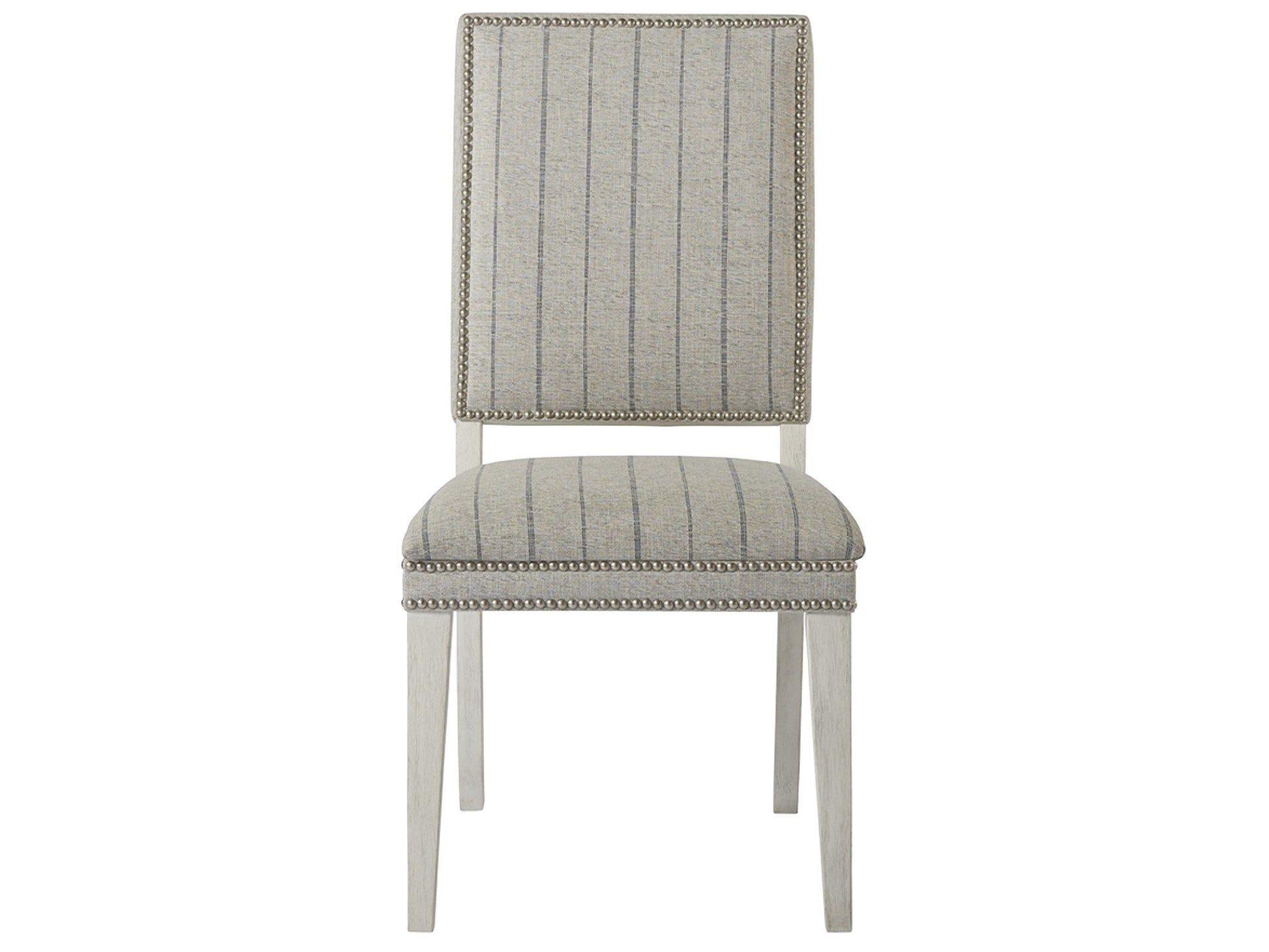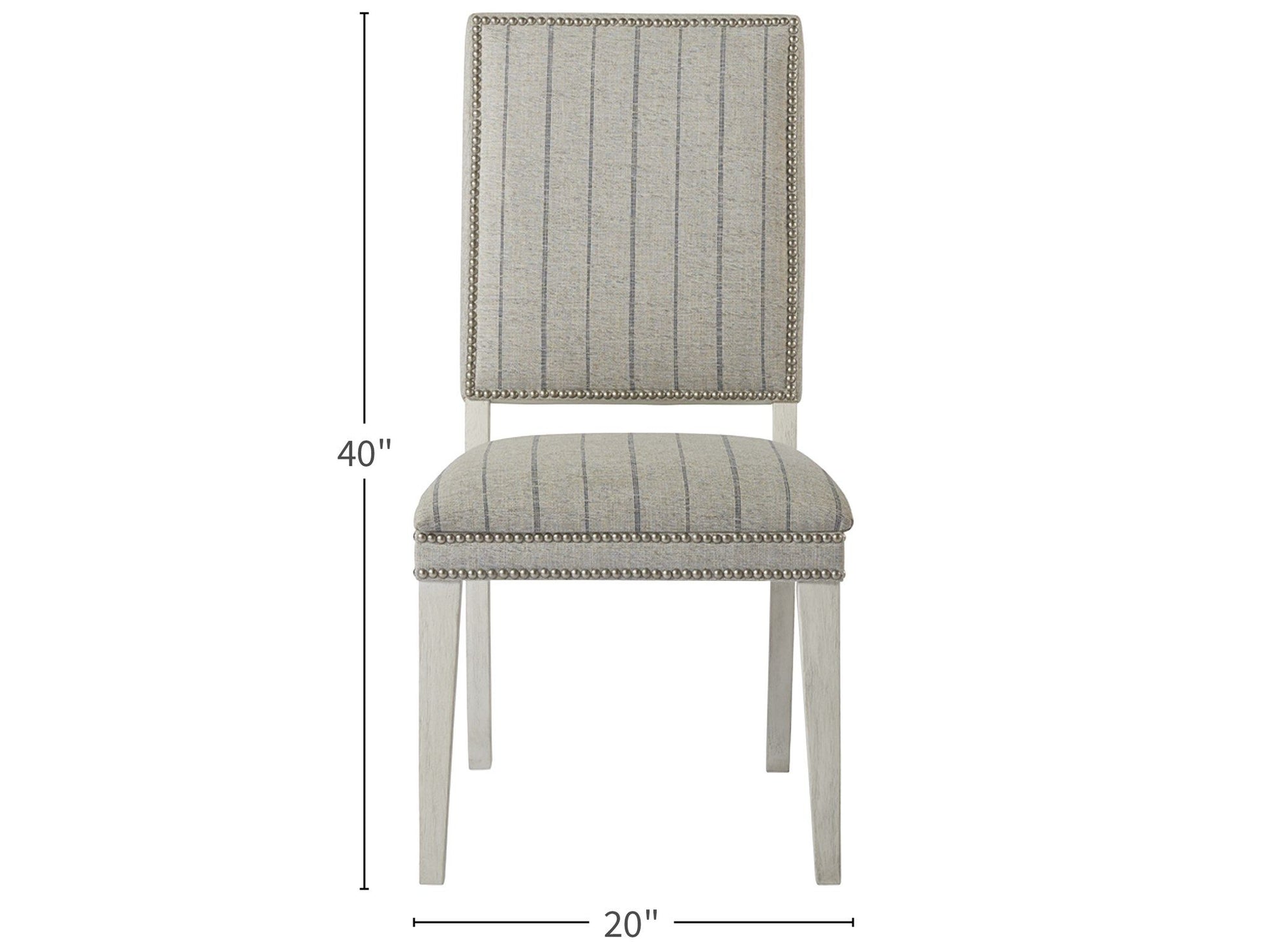 The Hamptons Dining Chair features a tall, slender silhouette upholstered in a finely striped fabric, strong tapered legs and a delicate nail head trim.