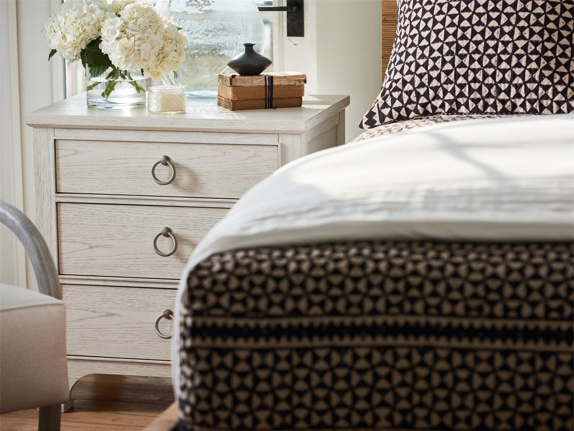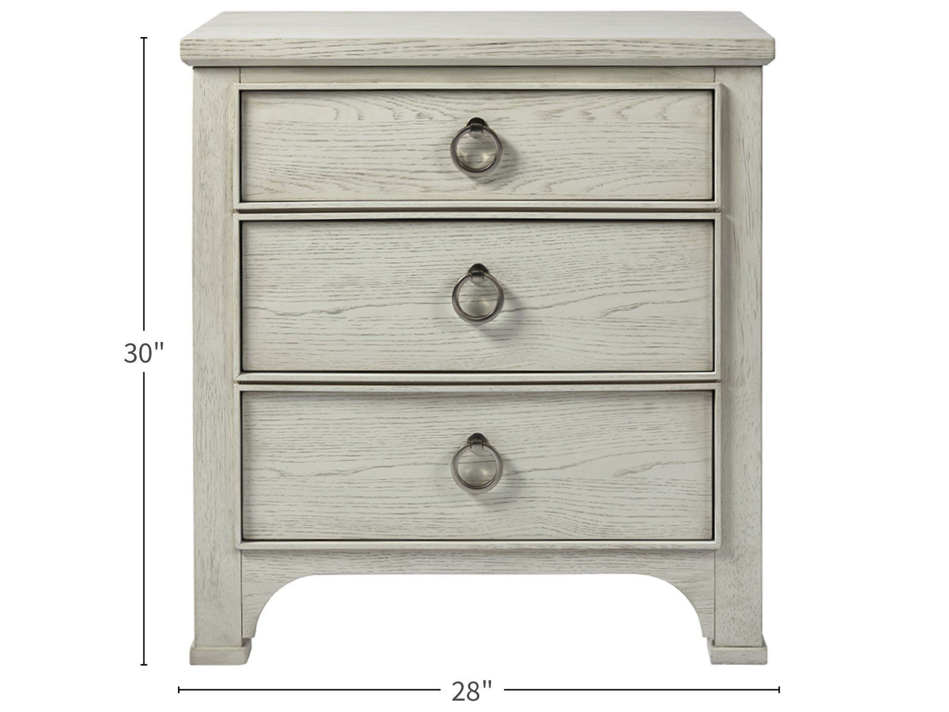 Add a soft touch to bedroom spaces with the Escape Nightstand, a clean bedside punctuation with simple lines, three drawers, and complementing ring-pull hardware.