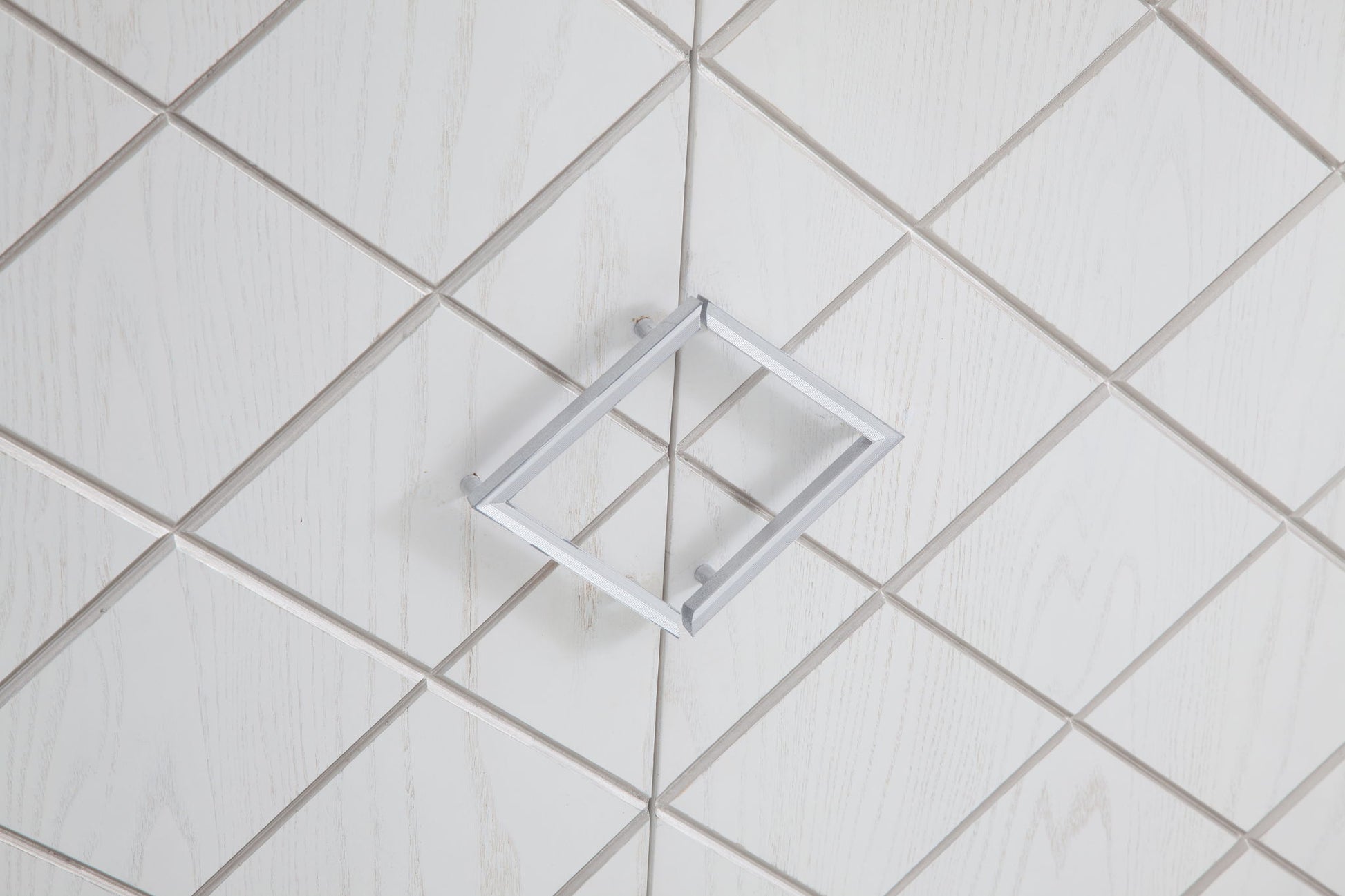 - Features silver routed diamond pattern with complementing hardware over a white flat cut oak veneer finish