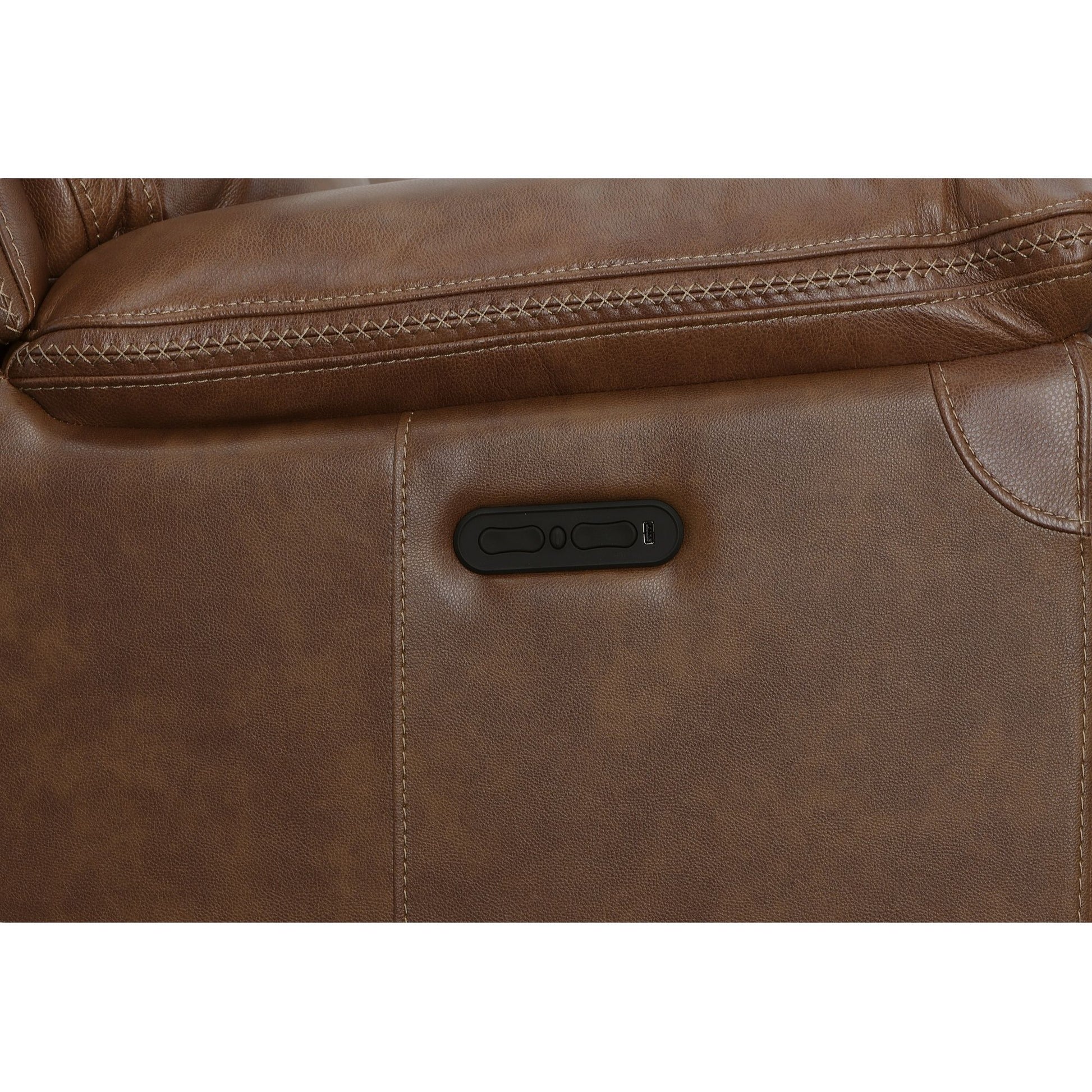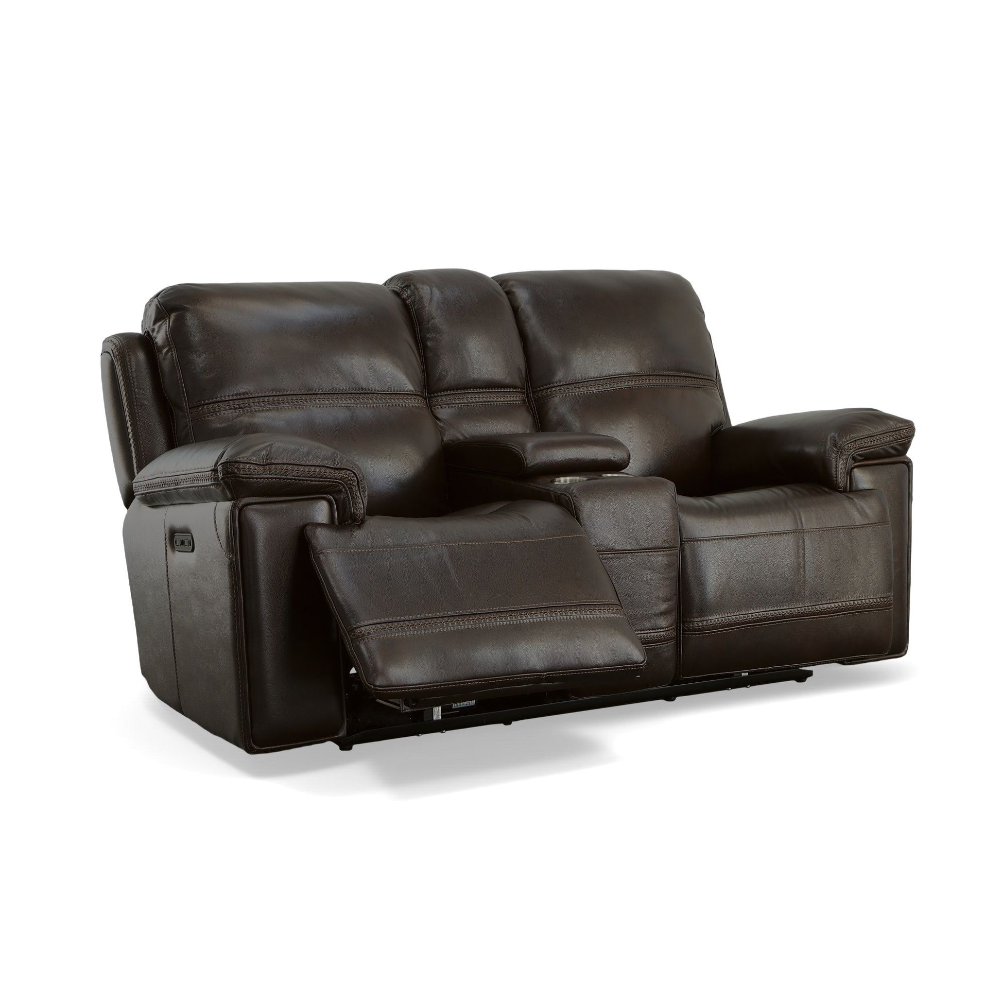 Introduce a sophisticated touch to your living room with the Fenwick power reclining loveseat with power headrests. This elegant piece showcases unique, banded cross-stitching details that add a refined texture and visual appeal to its premium, cognac brown leather upholstery. The plush, divided back cushions and fully padded footrests offer supreme comfort, perfect for relaxing after a long day. With independently adjustable recline and headrest support, you can effortlessly find your ideal position at the touch of a button. Plus, the center console provides a place for drinks and storing remotes, magazines, and more. Flexsteel’s patented Blue Steel Spring™ technology offers unparalleled durability and support, making this loveseat a lasting addition to your home.