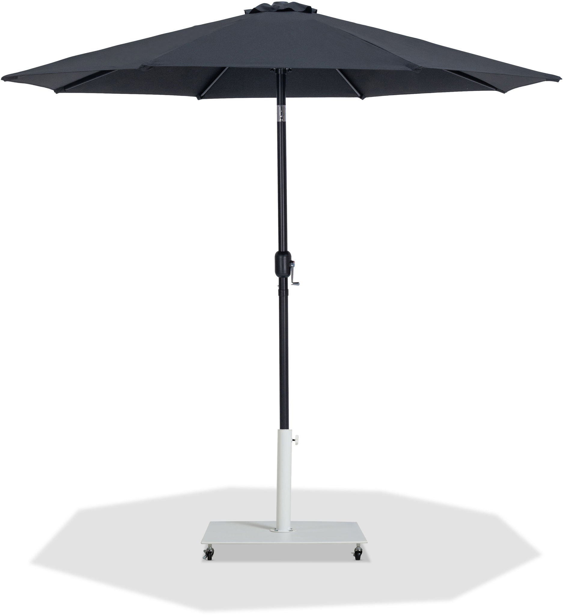 Bask in the shade wherever it's needed when you bring home this Fiji fabric and matte black aluminum patio umbrella with matte white base set. This ingenious umbrella and base can be used as a standalone umbrella on a deck or patio - or add it to your choice of table for a sturdy solution for hiding from the sun's rays. The aluminum pole weathers the elements like a champ, and the umbrella is crafted from water-resistant fabric for a beautiful, lasting look. Casters on the base make for easy portability.