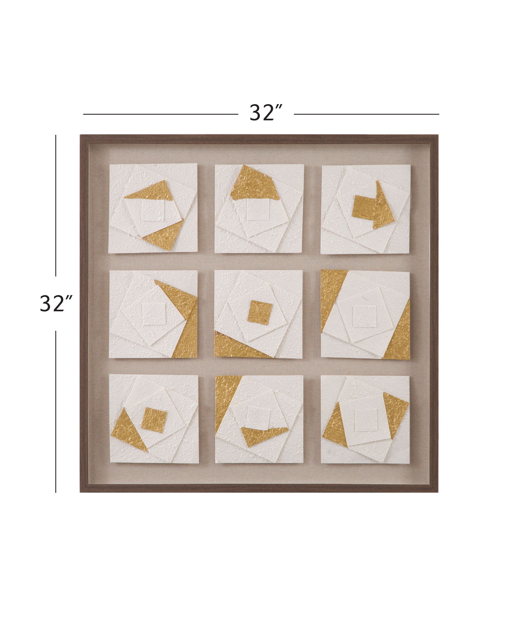 The Framework Wall Art features a modern shadowbox style design, combining a neutral linen background with nine 3D square abstract pieces. The striking white and gold accents of the pieces create a bold contrast, adding depth and visual interest to the artwork. The brown frame complements the design, providing a natural and grounding touch. This piece effortlessly blends contemporary aesthetics with artistic sophistication, making it a perfect addition to a variety of interior spaces.