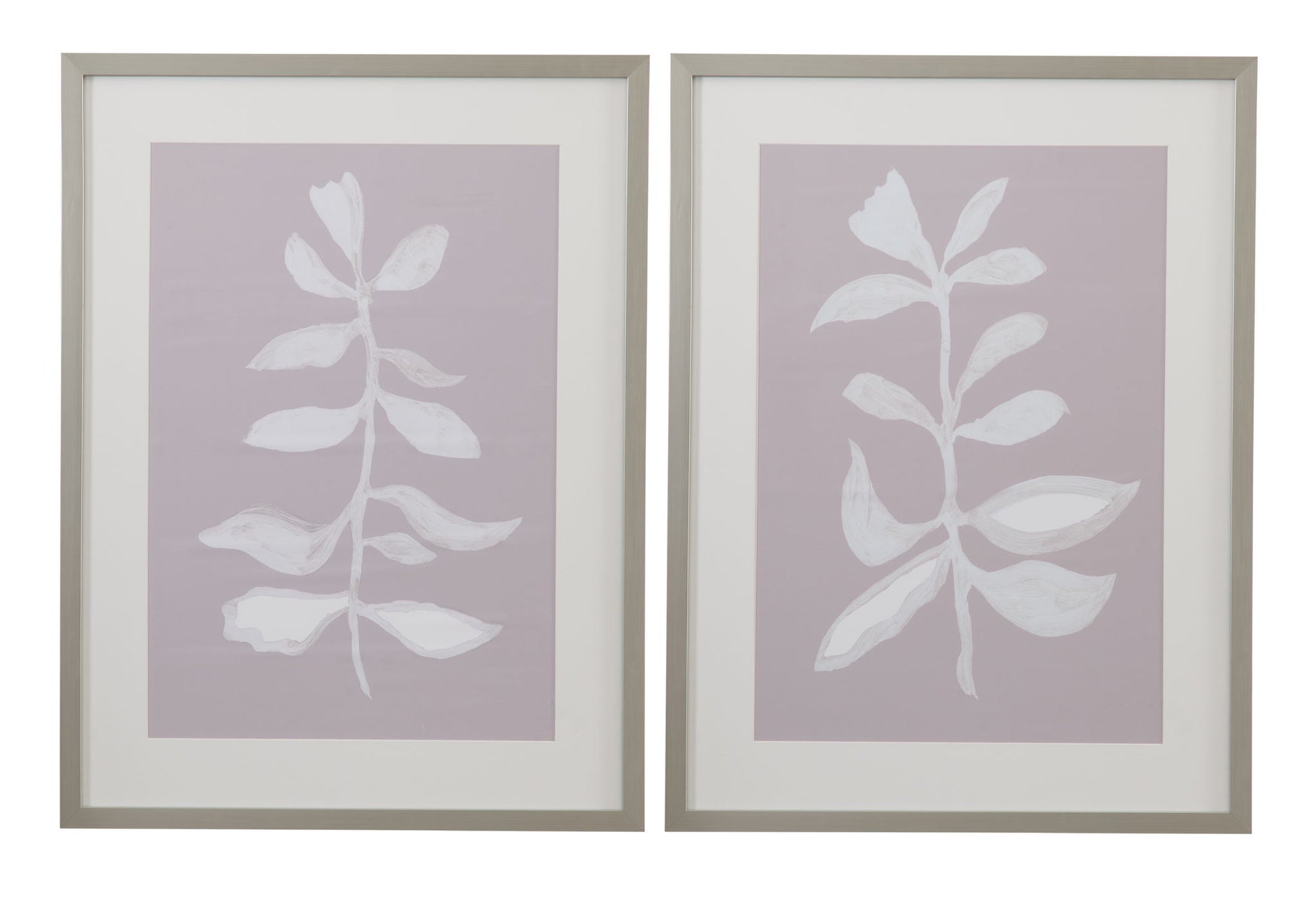 Fresh Leaves is a set of two prints framed in a silver shadow box 1" molding with a pure white matboard with a silver edge on the interior of the matboard.